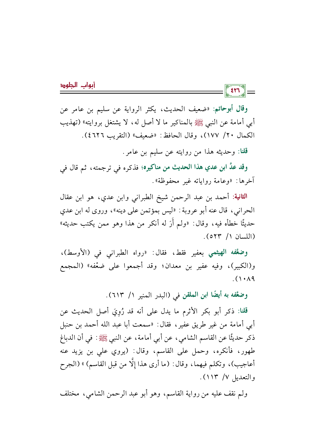 قلنا: ذكر أبو بكر الأثرم ما يدل على أنه قد رُوِيَ أصل الحديث عن أبي أمامة من غير طريق عفير، فقال: ((سمعت أبا عبد الله أحمد بن حنبل ذكر حديثًا عن القاسم الشامي، عن أبي أمامة، عن النبي صلى الله عليه وسلم: في أن الدباغ طهور، فأنكره، وحمل على القاسم، وقال: (يروي علي بن يزيد عنه أعاجيب)، وتكلم فيهما، وقال: (ما أرى هذا إِلَّا من قبل القاسم))) (الجرح والتعديل ٧/ ١١٣).