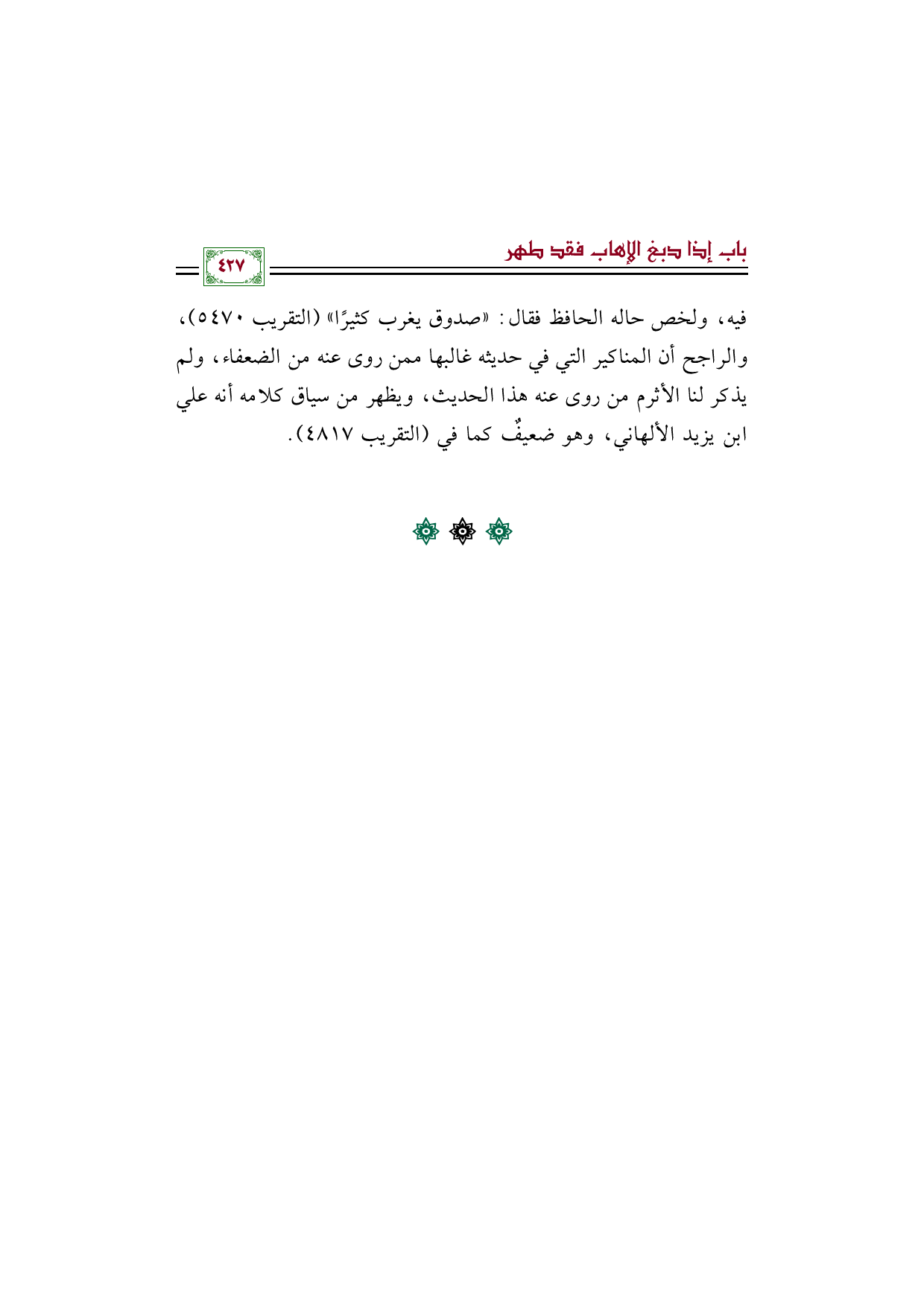 فيه، ولخص حاله الحافظ فقال: ((صدوق يغرب كثيرًا)) (التقريب ٥٤٧٠)، والراجح أن المناكير التي في حديثه غالبها ممن روى عنه من الضعفاء، ولم يذكر لنا الأثرم من روى عنه هذا الحديث، ويظهر من سياق كلامه أنه علي بن يزيد الألهاني، وهو ضعيفٌ كما في (التقريب ٤٨١٧).
