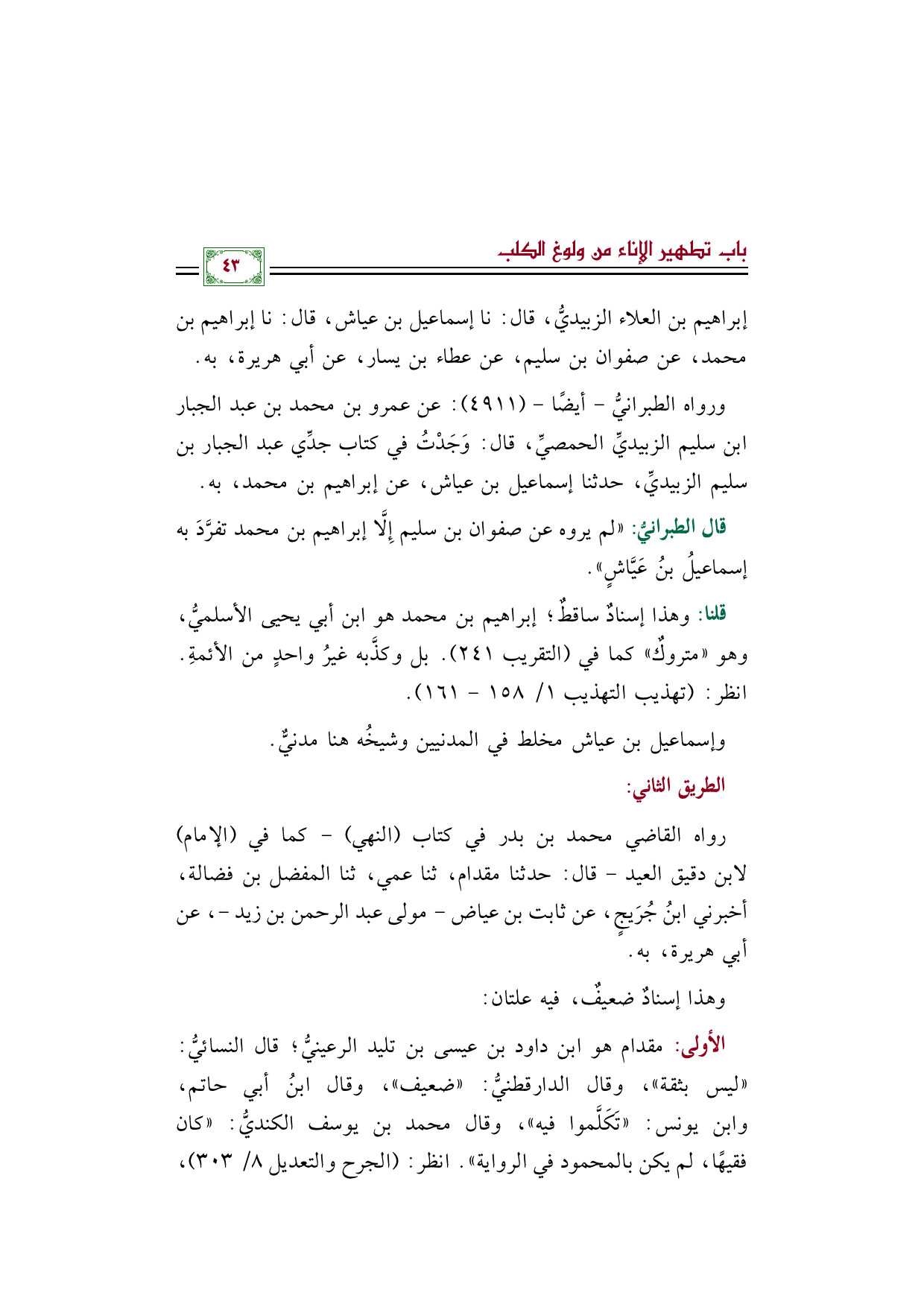 ورواه الطبرانيُّ -أيضًا- (٤٩١١): عن عمرو بن محمد بن عبد الجبار بن سليم الزبيديِّ الحمصيِّ، قال: وَجَدْتُ في كتاب جدِّي عبد الجبار بن سليم الزبيديِّ، حدثنا إسماعيل بن عياش، عن إبراهيم بن محمد، به.