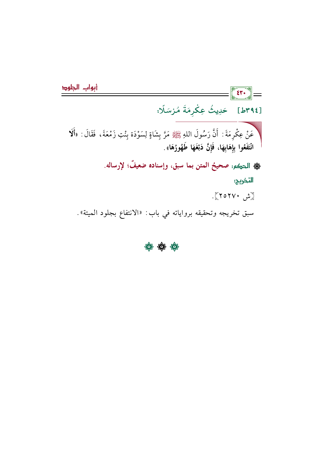 ◼ عَنْ عِكْرِمَةَ: أَنَّ رَسُولَ اللهِ صلى الله عليه وسلم مَرَّ بِشَاةٍ لِسَوْدَة بِنْتِ زَمْعَةَ، فَقَالَ: ((أَلَا انْتَفَعُوا بِإِهَابِهَا، فَإِنَّ دَبْغَهَا طَهُورُهَا)).