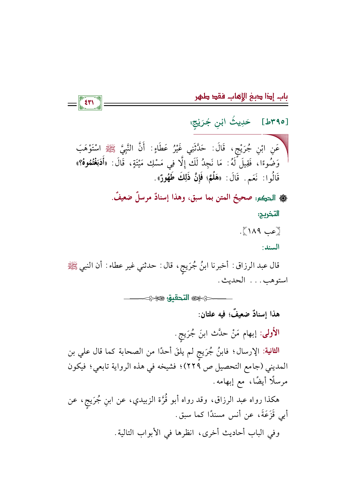 ◼ عَنِ ابْنِ جُرَيْجٍ، قَالَ: حَدَّثَنِي غَيْرُ عَطَاءٍ: أَنَّ النَّبِيَّ صلى الله عليه وسلم اسْتَوْهَبَ وَضُوءًا، فَقِيلَ لَهُ: مَا نَجِدُ لَكَ إِلَّا فِي مَسْكِ مَيْتَةٍ، قَالَ: ((أَدَبَغْتُمُوهُ؟ )) قَالُوا: نَعَم. قَالَ: ((هَلُمَّ؛ فَإِنَّ ذَلِكَ طَهُورٌ)).
