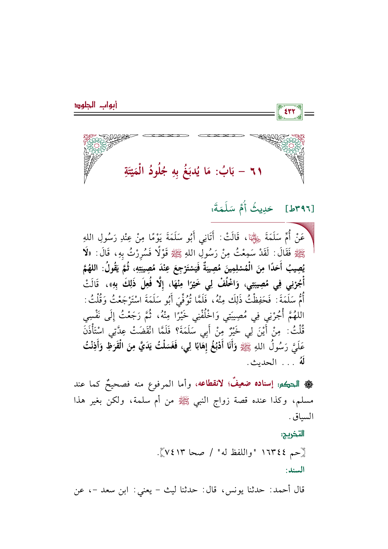 ◼ عَنْ أُمِّ سَلَمَةَ رضي الله عنها، قَالَتْ: أَتَانِي أَبُو سَلَمَةَ يَوْمًا مِنْ عِنْدِ رَسُولِ اللهِ صلى الله عليه وسلم فَقَالَ: لَقَدْ سَمِعْتُ مِنْ رَسُولِ اللهِ صلى الله عليه وسلم قَوْلًا فَسُرِرْتُ بِهِ، قَالَ: ((لَا يُصِيبُ أَحَدًا مِنَ الْمُسْلِمِينَ مُصِيبَةٌ فَيَسْتَرْجِعَ عِنْدَ مُصِيبَتِهِ، ثُمَّ يَقُولُ: اللهُمَّ أْجُرْنِي فِي مُصِيبَتِي، وَاخْلُفْ لِي خَيْرًا مِنْهَا، إِلَّا فُعِلَ ذَلِكَ بِهِ))، قَالَتْ أُمُّ سَلَمَةَ: فَحَفِظْتُ ذَلِكَ مِنْهُ، فَلَمَّا تُوُفِّيَ أَبُو سَلَمَةَ اسْتَرْجَعْتُ وَقُلْتُ: اللهُمَّ أْجُرْنِي فِي مُصِيبَتِي وَاخْلُفْنِي خَيْرًا مِنْهُ، ثُمَّ رَجَعْتُ إِلَى نَفْسِي قُلْتُ: مِنْ أَيْنَ لِي خَيْرٌ مِنْ أَبِي سَلَمَةَ؟ فَلَمَّا انْقَضَتْ عِدَّتِي اسْتَأْذَنَ عَلَيَّ رَسُولُ اللهِ صلى الله عليه وسلم وَأَنَا أَدْبُغُ إِهَابًا لِي، فَغَسَلْتُ يَدَيَّ مِنَ الْقَرَظِ وَأَذِنْتُ لَهُ ... الحديث.