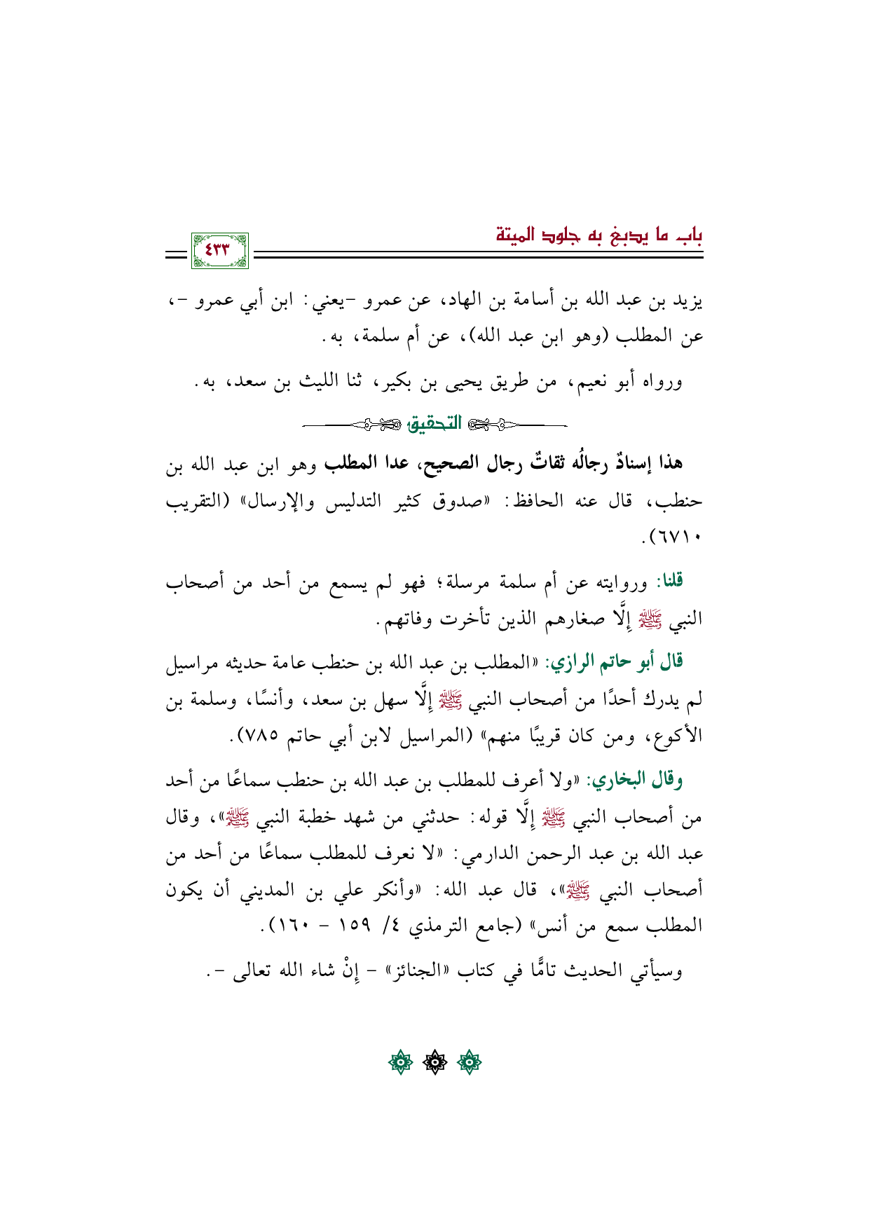 وقال البخاري: ((ولا أعرف للمطلب بن عبد الله بن حنطب سماعًا من أحد من أصحاب النبي صلى الله عليه وسلم إِلَّا قوله: حدثني من شهد خطبة النبي صلى الله عليه وسلم))، وقال عبد الله بن عبد الرحمن الدارمي: ((لا نعرف للمطلب سماعًا من أحد من أصحاب النبي صلى الله عليه وسلم))، قال عبد الله: ((وأنكر علي بن المديني أن يكون المطلب سمع من أنس)) (جامع الترمذي ٤/ ١٥٩ - ١٦٠).