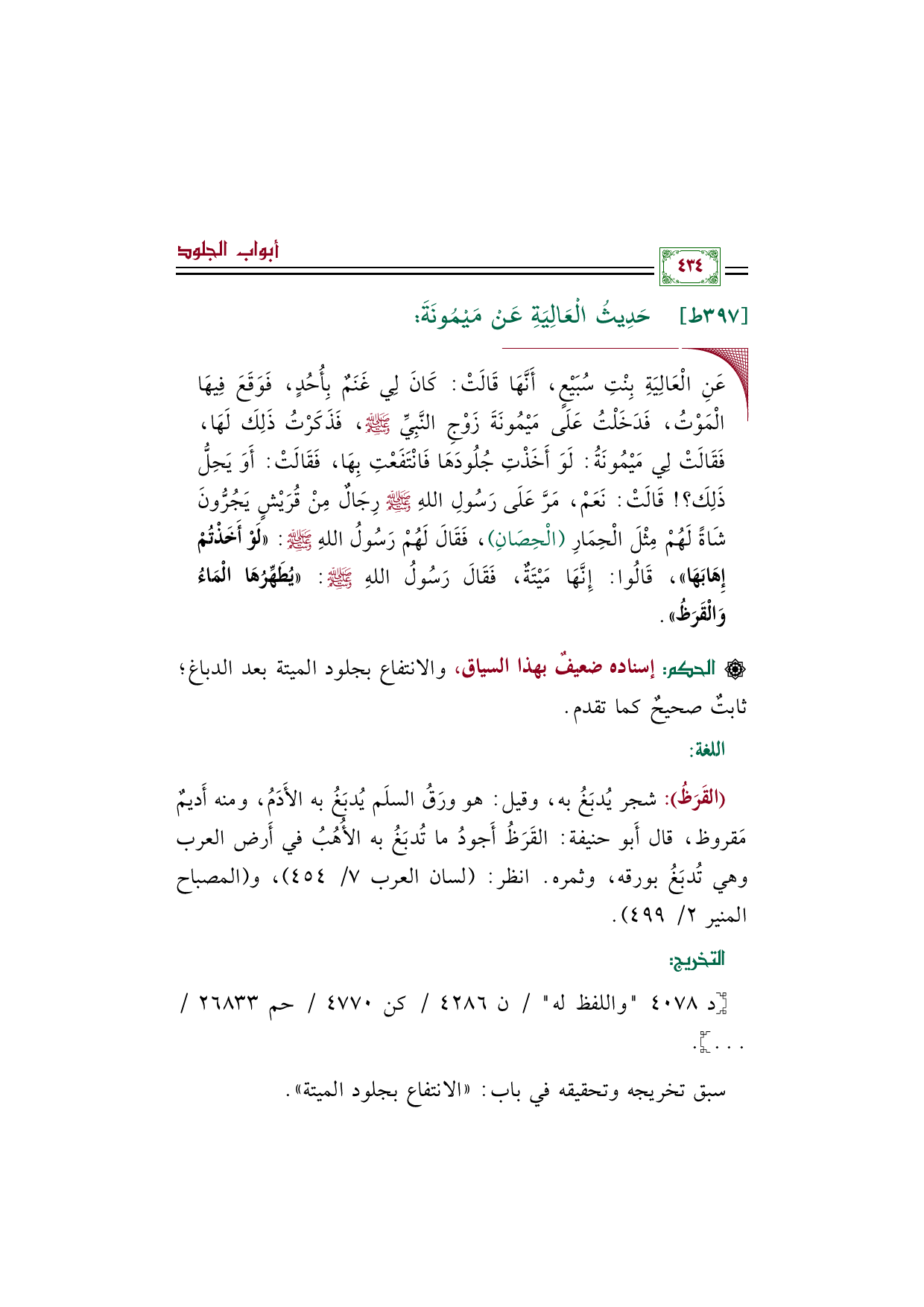 ◼ عَنِ الْعَالِيَةِ بِنْتِ سُبَيْعٍ، أَنَّهَا قَالَتْ: كَانَ لِي غَنَمٌ بِأُحُدٍ، فَوَقَعَ فِيهَا الْمَوْتُ، فَدَخَلْتُ عَلَى مَيْمُونَةَ زَوْجِ النَّبِيِّ صلى الله عليه وسلم، فَذَكَرْتُ ذَلِكَ لَهَا، فَقَالَتْ لِي مَيْمُونَةُ: لَوَ أَخَذْتِ جُلُودَهَا فَانْتَفَعْتِ بِهَا، فَقَالَتْ: أَوَ يَحِلُّ ذَلِكَ؟ ! قَالَتْ: نَعَمْ، مَرَّ عَلَى رَسُولِ اللهِ صلى الله عليه وسلم رِجَالٌ مِنْ قُرَيْشٍ يَجُرُّونَ شَاةً لَهُمْ مِثْلَ الْحِمَارِ (الْحِصَانِ)، فَقَالَ لَهُمْ رَسُولُ اللهِ صلى الله عليه وسلم: ((لَوْ أَخَذْتُمْ إِهَابَهَا))، قَالُوا: إِنَّهَا مَيْتَةٌ، فَقَالَ رَسُولُ اللهِ صلى الله عليه وسلم: ((يُطَهِّرُهَا الْمَاءُ وَالْقَرَظُ)).