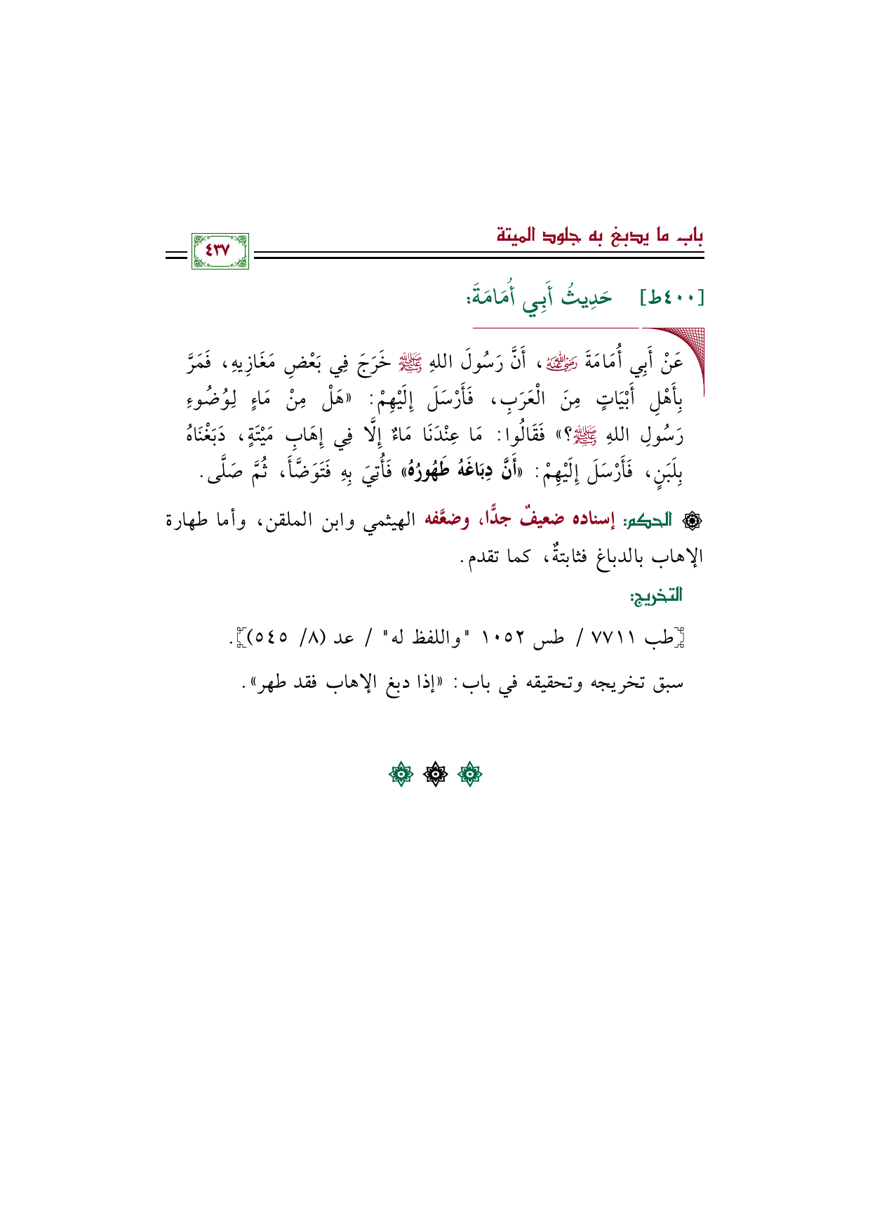 ◼ عَنْ أَبِي أُمَامَةَ رضي الله عنه، أَنَّ رَسُولَ اللهِ صلى الله عليه وسلم خَرَجَ فِي بَعْضِ مَغَازِيهِ، فَمَرَّ بِأَهْلِ أَبْيَاتٍ مِنَ الْعَرَبِ، فَأَرْسَلَ إِلَيْهِمْ: ((هَلْ مِنْ مَاءٍ لِوُضُوءِ رَسُولِ اللهِ صَلَّى الله عَلَيْهِ وَسَلَّمْ؟ )) فَقَالُوا: مَا عِنْدَنَا مَاءٌ إِلَّا فِي إِهَابِ مَيْتَةٍ، دَبَغْنَاهُ بِلَبَنٍ، فَأَرْسَلَ إِلَيْهِمْ: ((أَنَّ دِبَاغَهُ طَهُورُهُ)) فَأُتِيَ بِهِ فَتَوَضَّأَ، ثُمَّ صَلَّى.