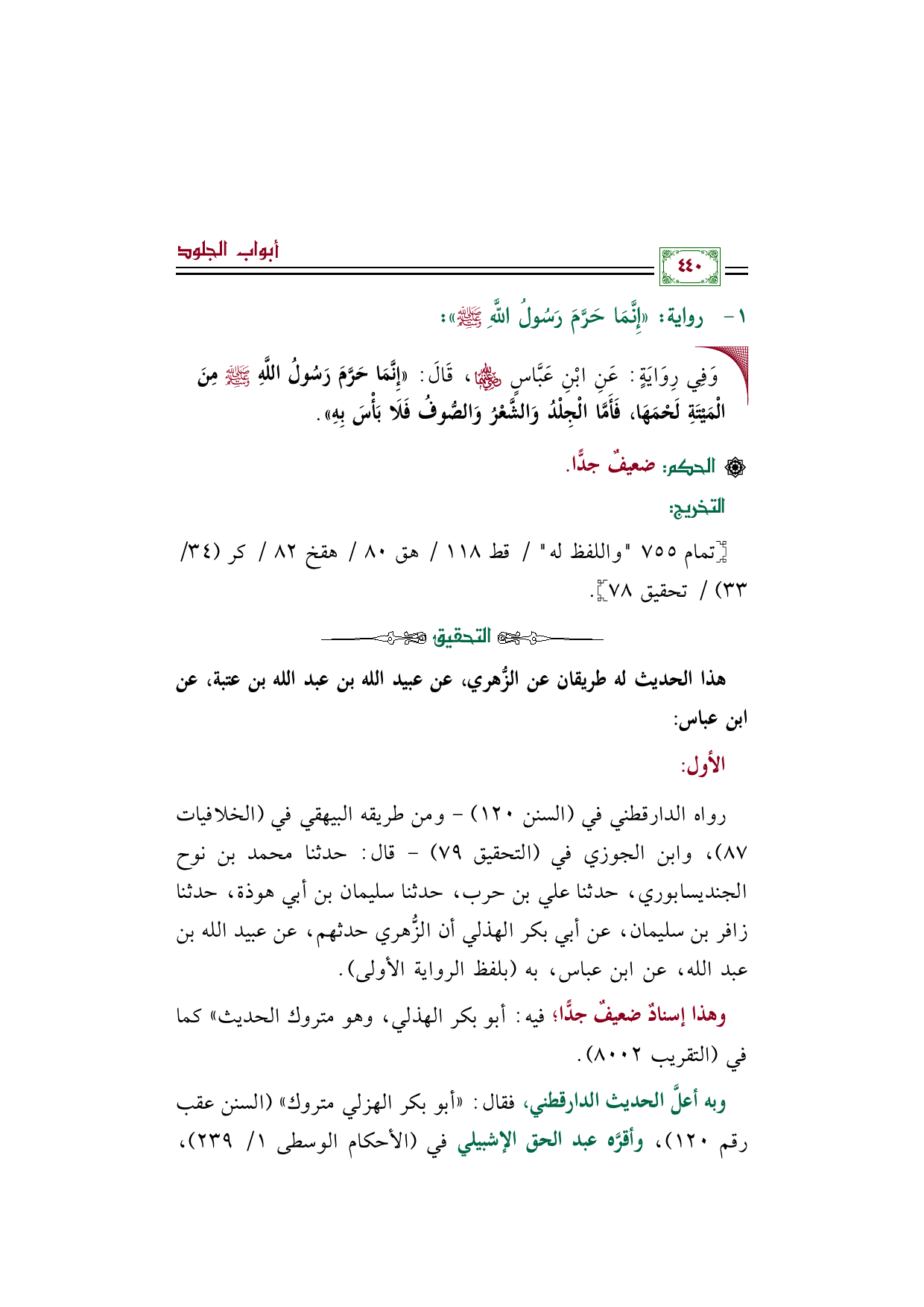 رواه الدارقطني في (السنن ١٢٠) -ومن طريقه البيهقي في (الخلافيات ٨٧)، وابن الجوزي في (التحقيق ٧٩) - قال: حدثنا محمد بن نوح الجنديسابوري، حدثنا علي بن حرب، حدثنا سليمان بن أبي هوذة، حدثنا زافر بن سليمان، عن أبي بكر الهذلي أن الزُّهري حدثهم، عن عبيد الله بن عبد الله، عن ابن عباس، به (بلفظ الرواية الأولى).