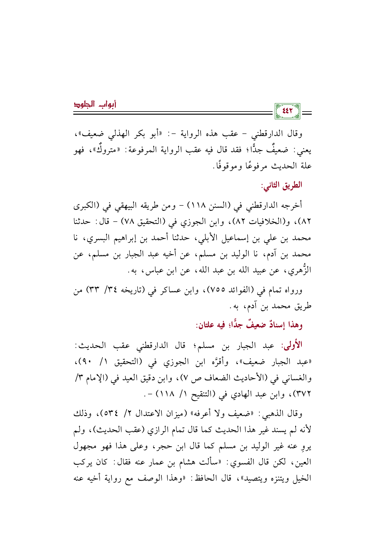 أخرجه الدارقطني في (السنن ١١٨) -ومن طريقه البيهقي في (الكبرى ٨٢)، و (الخلافيات ٨٢)، وابن الجوزي في (التحقيق ٧٨) - قال: حدثنا محمد بن علي بن إسماعيل الأبلي، حدثنا أحمد بن إبراهيم البسري، نا محمد بن آدم، نا الوليد بن مسلم، عن أخيه عبد الجبار بن مسلم، عن الزُّهري، عن عبيد الله بن عبد الله، عن ابن عباس، به.