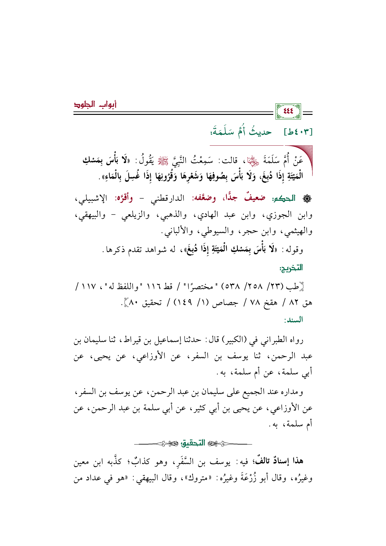 رواه الطبراني في (الكبير) قال: حدثنا إسماعيل بن قيراط، ثنا سليمان بن عبد الرحمن، ثنا يوسف بن السفر، عن الأوزاعي، عن يحيى، عن أبي سلمة، عن أم سلمة، به.