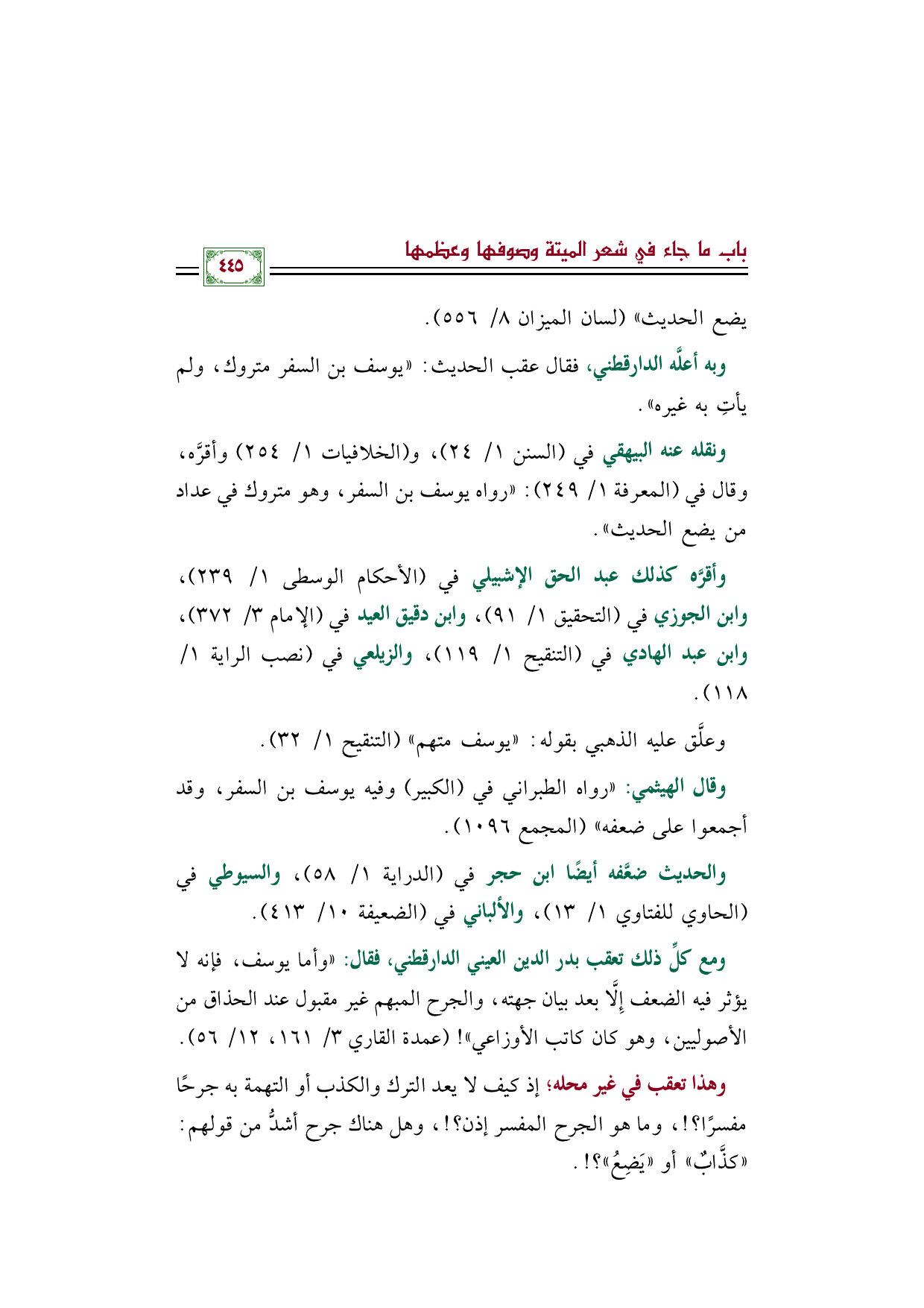 ومع كلِّ ذلك تعقب بدر الدين العيني الدارقطني، فقال: ((وأما يوسف، فإنه لا يؤثر فيه الضعف إِلَّا بعد بيان جهته، والجرح المبهم غير مقبول عند الحذاق من الأصوليين، وهو كان كاتب الأوزاعي))! (عمدة القاري ٣/ ١٦١، ١٢/ ٥٦).