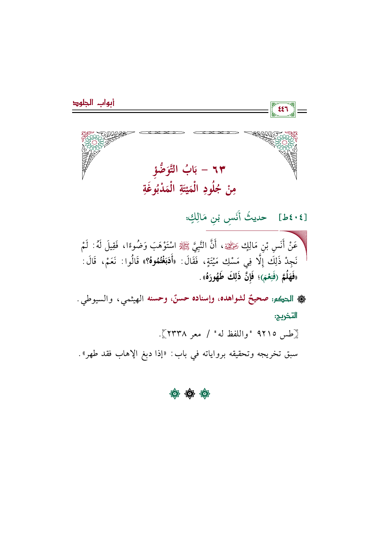 ◼ عَنْ أَنَسِ بْنِ مَالِكٍ رضي الله عنه، أَنَّ النَّبِيَّ صلى الله عليه وسلم اسْتَوْهَبَ وَضُوءًا، فَقِيلَ لَهُ: لَمْ نَجِدْ ذَلِكَ إِلَّا فِي مَسْكِ مَيْتَةٍ، فَقَالَ: ((أَدَبَغْتُمُوهُ؟ )) قَالُوا: نَعَمْ، قَالَ: ((فَهَلُمَّ (فَنِعْمَ)؛ فَإِنَّ ذَلِكَ طَهُورَهُ)).