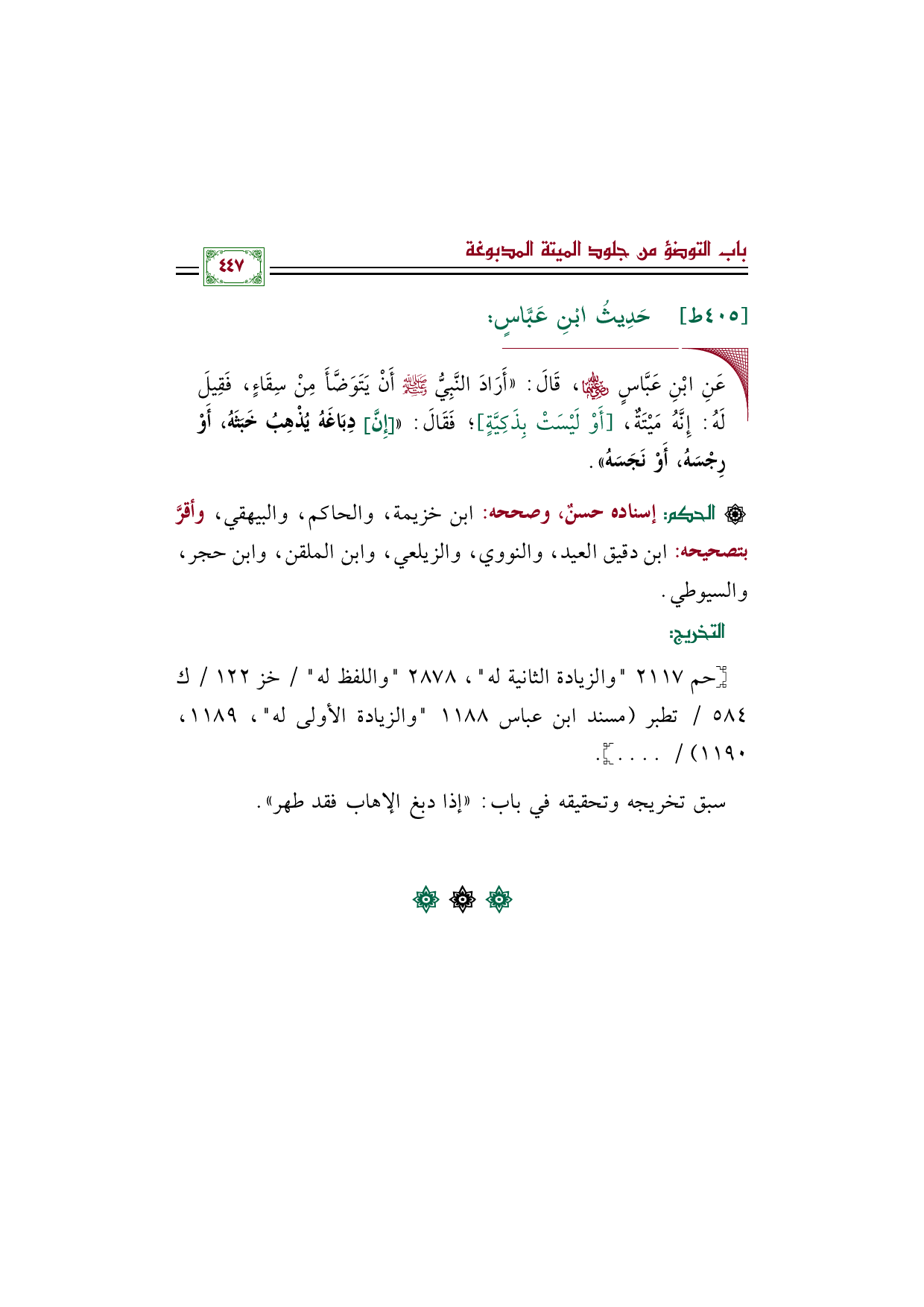 ◼ عَنِ ابْنِ عَبَّاسٍ رضي الله عنهما، قَالَ: ((أَرَادَ النَّبِيُّ صلى الله عليه وسلم أَنْ يَتَوَضَّأَ مِنْ سِقَاءٍ، فَقِيلَ لَهُ: إِنَّهُ مَيْتَةٌ، [أَوْ لَيْسَتْ بِذَكِيَّةٍ]؛ فَقَالَ: (([إِنَّ] دِبَاغَهُ يُذْهِبُ خَبَثَهُ، أَوْ رِجْسَهُ، أَوْ نَجَسَهُ)).