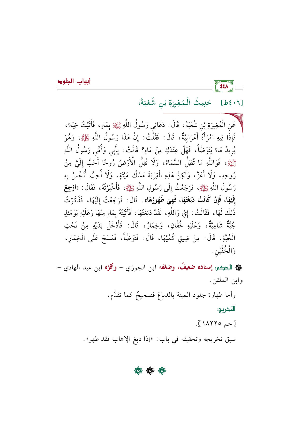 ◼ عَنِ الْمُغِيرَةِ بْنِ شُعْبَةَ، قَالَ: دَعَانِي رَسُولُ اللَّهِ صلى الله عليه وسلم بِمَاءٍ، فَأَتَيْتُ خِبَاءً، فَإِذَا فِيهِ امْرَأَةٌ أَعْرَابِيَّةٌ، قَالَ: فَقُلْتُ: إِنَّ هَذَا رَسُولُ اللَّهِ صلى الله عليه وسلم، وَهُوَ يُرِيدُ مَاءً يَتَوَضَّأُ، فَهَلْ عِنْدَكِ مِنْ مَاءٍ؟ قَالَتْ: بِأَبِي وَأُمِّي رَسُولُ اللَّهِ صلى الله عليه وسلم، فَوَاللَّهِ مَا تُظِلُّ السَّمَاءُ، وَلَا تُقِلُّ الْأَرْضُ رُوحًا أَحَبَّ إِلَيَّ مِنْ رُوحِهِ، وَلَا أَعَزَّ، وَلَكِنَّ هَذِهِ الْقِرْبَةَ مَسْكُ مَيْتَةٍ، وَلَا أُحِبُّ أُنَجِّسُ بِهِ رَسُولَ اللَّهِ صلى الله عليه وسلم، فَرَجَعْتُ إِلَى رَسُولِ اللَّهِ صلى الله عليه وسلم، فَأَخْبَرْتُهُ، فَقَالَ: ((ارْجِعْ إِلَيْهَا، فَإِنْ كَانَتْ دَبَغَتْهَا، فَهِيَ طَهُورُهَا)). قَالَ: فَرَجَعْتُ إِلَيْهَا، فَذَكَرْتُ ذَلِكَ لَهَا، فَقَالَتْ: إِيْ وَاللَّهِ، لَقَدْ دَبَغْتُهَا، فَأَتَيْتُهُ بِمَاءٍ مِنْهَا وَعَلَيْهِ يَوْمَئِذٍ جُبَّةٌ شَامِيَّةٌ، وَعَلَيْهِ خُفَّانِ، وَخِمَارٌ، قَالَ: فَأَدْخَلَ يَدَيْهِ مِنْ تَحْتِ الْجُبَّةِ، قَالَ: مِنْ ضِيقِ كُمَّيْهَا، قَالَ: فَتَوَضَّأَ، فَمَسَحَ عَلَى الْخِمَارِ، وَالْخُفَّيْنِ.