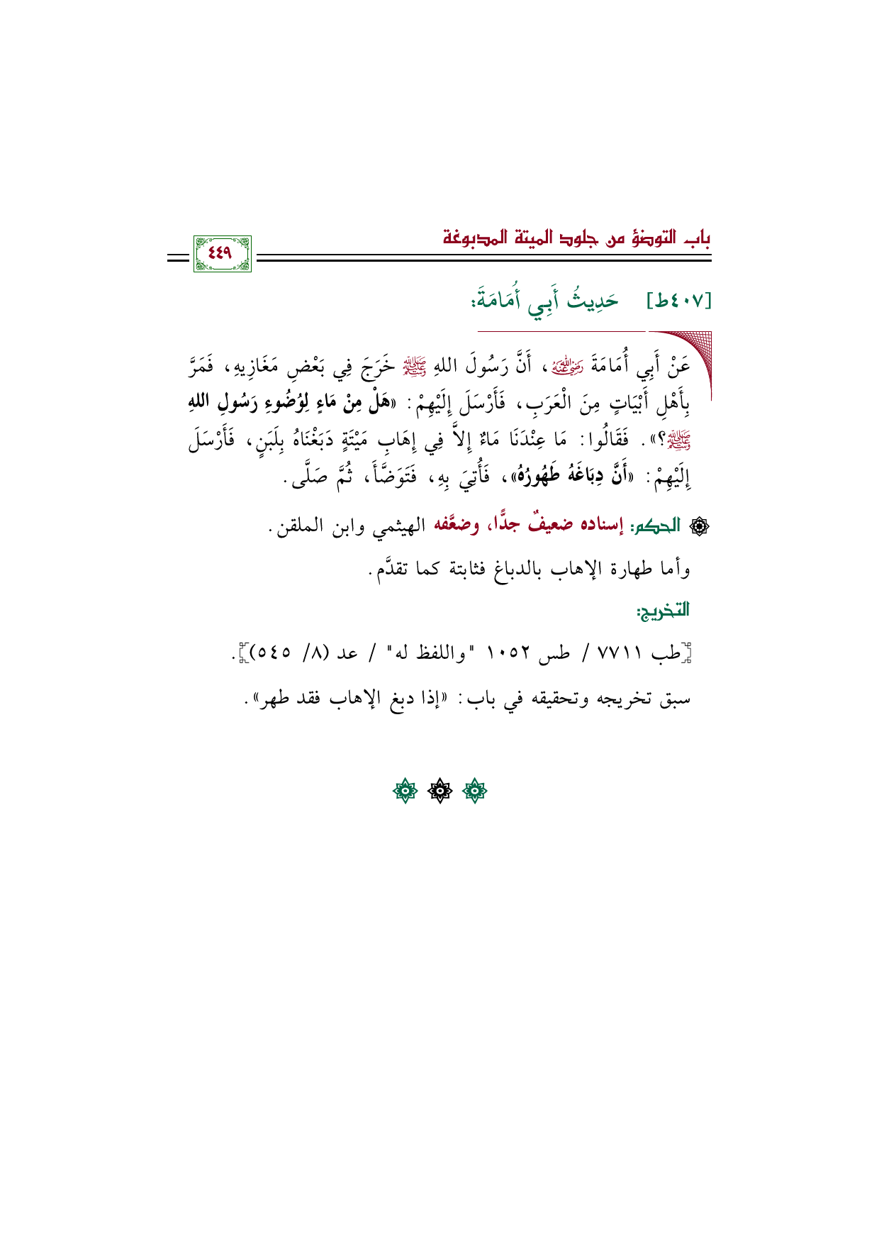 ◼ عَنْ أَبِي أُمَامَةَ رضي الله عنه، أَنَّ رَسُولَ اللهِ صلى الله عليه وسلم خَرَجَ فِي بَعْضِ مَغَازِيهِ، فَمَرَّ بِأَهْلِ أَبْيَاتٍ مِنَ الْعَرَبِ، فَأَرْسَلَ إِلَيْهِمْ: ((هَلْ مِنْ مَاءٍ لِوُضُوءِ رَسُولِ اللهِ صلى الله عليه وسلم؟ )). فَقَالُوا: مَا عِنْدَنَا مَاءٌ إِلَاّ فِي إِهَابِ مَيْتَةٍ دَبَغْنَاهُ بِلَبَنٍ، فَأَرْسَلَ إِلَيْهِمْ: ((أَنَّ دِبَاغَهُ طَهُورُهُ))، فَأُتِيَ بِهِ، فَتَوَضَّأَ، ثُمَّ صَلَّى.