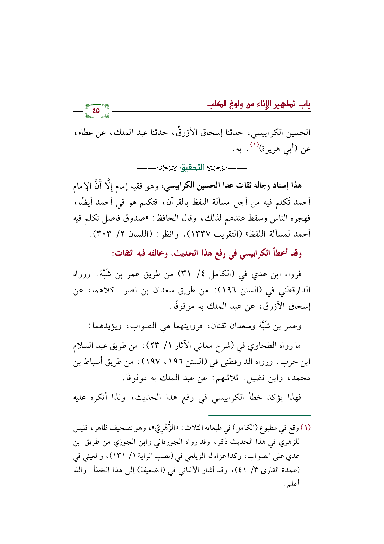 الحسين الكرابيسي، حدثنا إسحاق الأزرقُ، حدثنا عبد الملك، عن عطاء، عن (أبي هريرة) (¬١)، به.