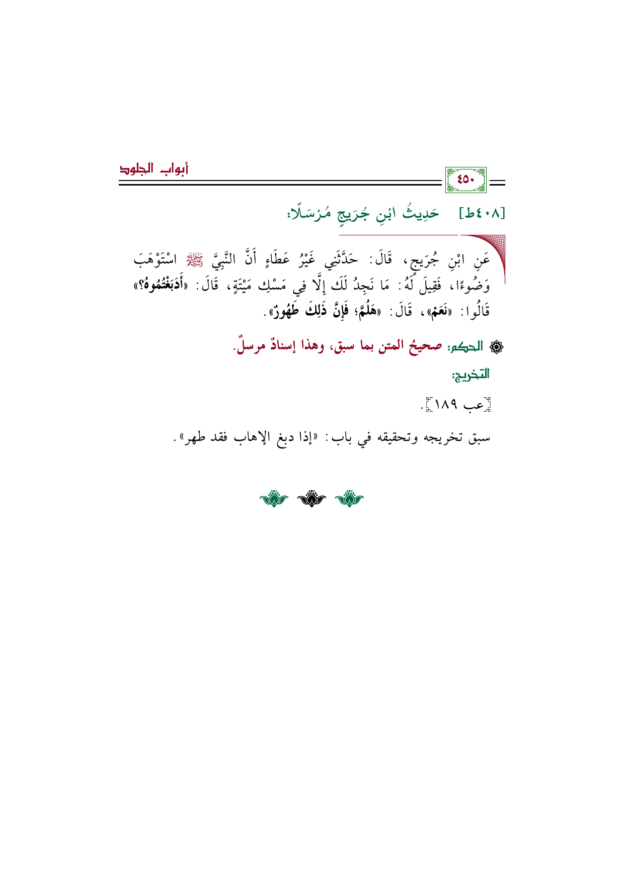 ◼ عَنِ ابْنِ جُرَيجٍ، قَالَ: حَدَّثَنِي غَيْرُ عَطَاءٍ أَنَّ النَّبِيَّ صلى الله عليه وسلم اسْتَوْهَبَ وَضُوءًا، فَقِيلَ لَهُ: مَا نَجِدُ لَكَ إِلَّا فِي مَسْكِ مَيْتَةٍ، قَالَ: ((أَدَبَغْتُمُوهُ؟ )) قَالُوا: ((نَعَمْ))، قَالَ: ((هَلُمَّ؛ فَإِنَّ ذَلِكَ طَهُورٌ)).