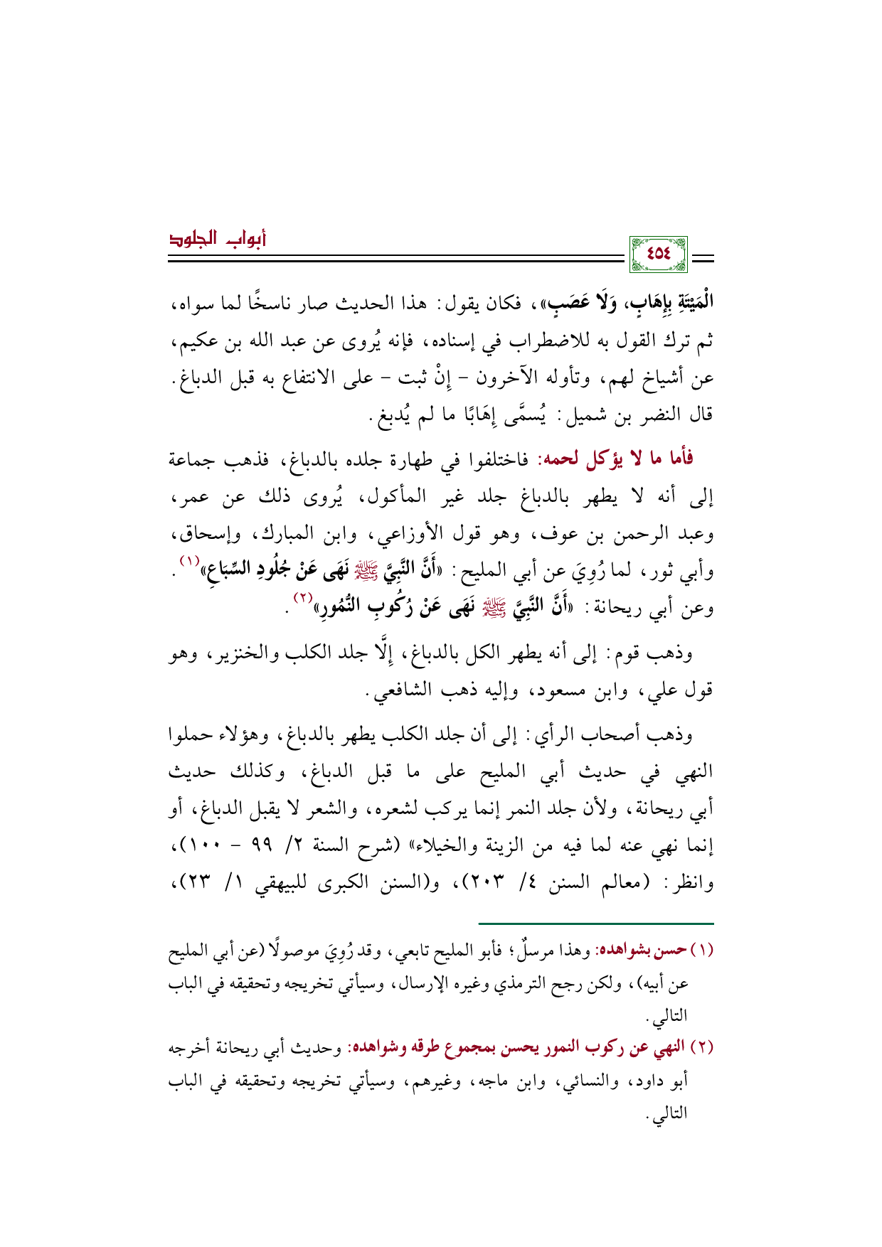 وذهب أصحاب الرأي: إلى أن جلد الكلب يطهر بالدباغ، وهؤلاء حملوا النهي في حديث أبي المليح على ما قبل الدباغ، وكذلك حديث أبي ريحانة، ولأن جلد النمر إنما يركب لشعره، والشعر لا يقبل الدباغ، أو إنما نهي عنه لما فيه من الزينة والخيلاء)) (شرح السنة ٢/ ٩٩ - ١٠٠)، وانظر: (معالم السنن ٤/ ٢٠٣)، و (السنن الكبرى للبيهقي ١/ ٢٣)،