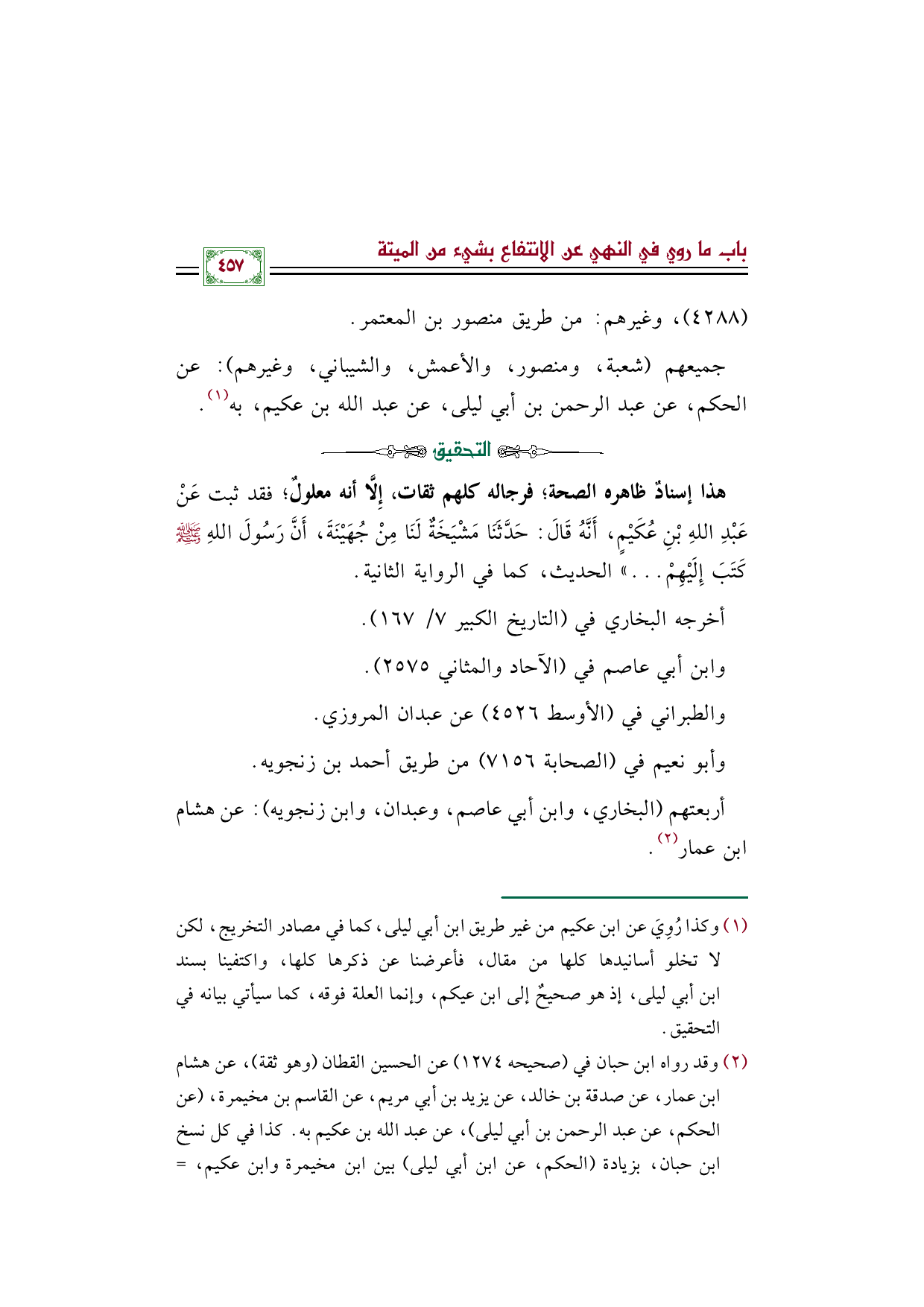 (¬٢) وقد رواه ابن حبان في (صحيحه ١٢٧٤) عن الحسين القطان (وهو ثقة)، عن هشام بن عمار، عن صدقة بن خالد، عن يزيد بن أبي مريم، عن القاسم بن مخيمرة، (عن الحكم، عن عبد الرحمن بن أبي ليلى)، عن عبد الله بن عكيم به. كذا في كل نسخ ابن حبان، بزيادة (الحكم، عن ابن أبي ليلى) بين ابن مخيمرة وابن عكيم، وكذا عزاه لابن حبان الزيلعي في (نصب الراية ١/ ١٢٠)، وابن الملقن في (البدر المنير ١/ ٥٨٨)، والحافظ ابن حجر في (إتحاف المهرة ٨/ ٢٥٩)، وقال: ((كذا رأيت فيه، فما أدري أسقط من إسناد الطحاوي أو زيد في إسناد ابن حبان، فيحرر من عندهما)). قلنا: وقد حررناه -بفضل الله- فتبين بما لا يدع مجالًا للشك، أن ذكر (الحكم، عن ابن أبي ليلى) مقحم في هذا السند؛ فقد رواه جماعة من الحفاظ عن هشام بدونها، وكذا رواه جماعة عن صدقة بن خالد، وكذا رواه جماعة عن يزيد بن أبي مريم. ثم إن القاسم لا يَروي عن الحكم، إنما يَروي عنه الحكم، كما عند مسلم وغيره، وكذا عند البخاري معلقًا، ولهذا اتفق كلُّ من ترجم للقاسم على ذكر الحكم فيمن روى عنه، لا العكس.