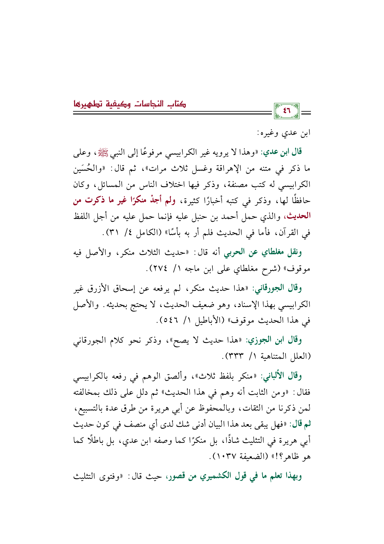 وقال الألباني: ((منكر بلفظ ثلاث))، وألصق الوهم في رفعه بالكرابيسي فقال: ((ومن الثابت أنه وهم في هذا الحديث)) ثم دلل على ذلك بمخالفته لمن ذكرنا من الثقات، وبالمحفوظ عن أبي هريرة من طرق عدة بالتسبيع، ثم قال: ((فهل يبقى بعد هذا البيان أدنى شك لدى أي منصف في كون حديث أبي هريرة في التثليث شاذًا، بل منكرًا كما وصفه ابن عدي، بل باطلًا كما هو ظاهر؟ ! )) (الضعيفة ١٠٣٧).