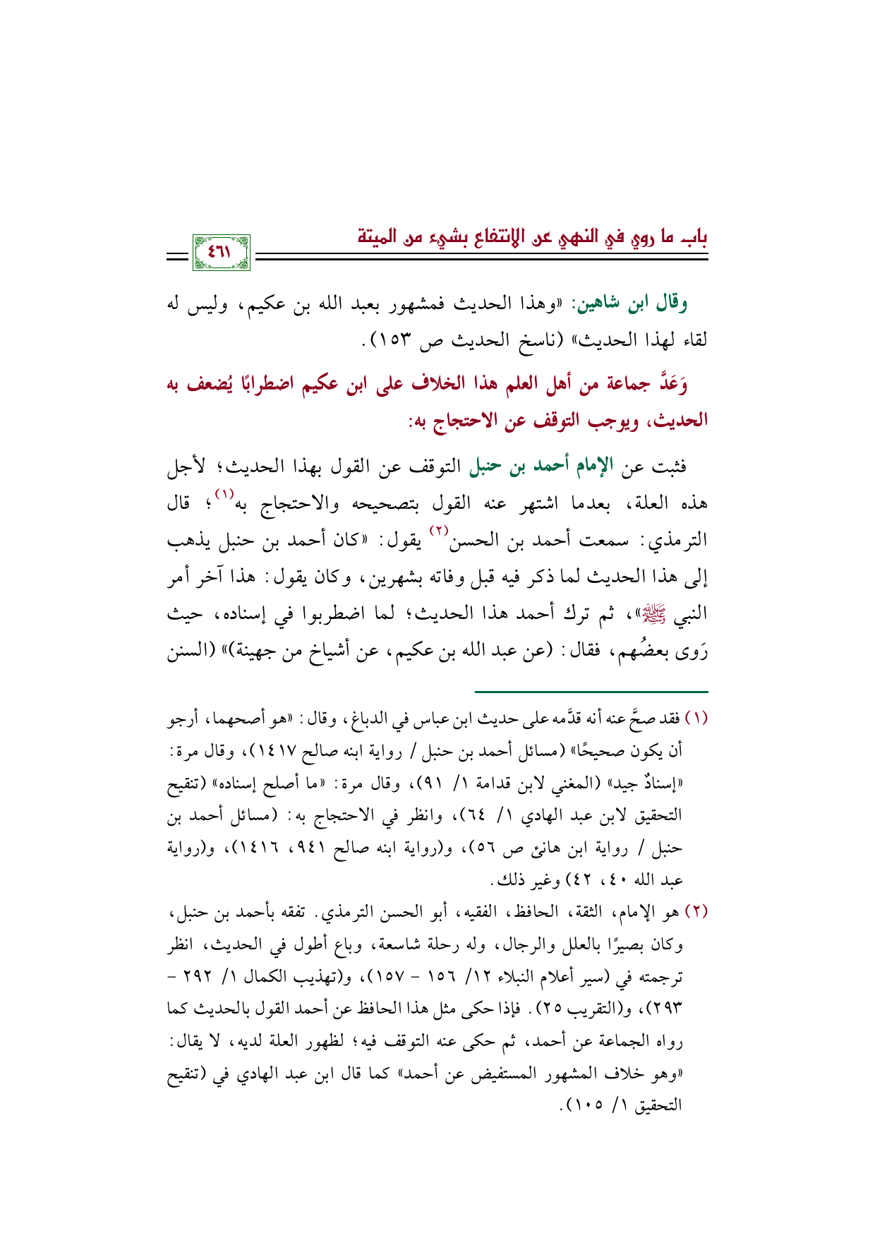 فثبت عن الإمام أحمد بن حنبل التوقف عن القول بهذا الحديث؛ لأجل هذه العلة، بعدما اشتهر عنه القول بتصحيحه والاحتجاج به (¬١)؛ قال الترمذي: سمعت أحمد بن الحسن (¬٢) يقول: ((كان أحمد بن حنبل يذهب إلى هذا الحديث لما ذكر فيه قبل وفاته بشهرين، وكان يقول: هذا آخر أمر النبي صلى الله عليه وسلم))، ثم ترك أحمد هذا الحديث؛ لما اضطربوا في إسناده، حيث رَوى بعضُهم، فقال: (عن عبد الله بن عكيم، عن أشياخ من جهينة))) (السنن
