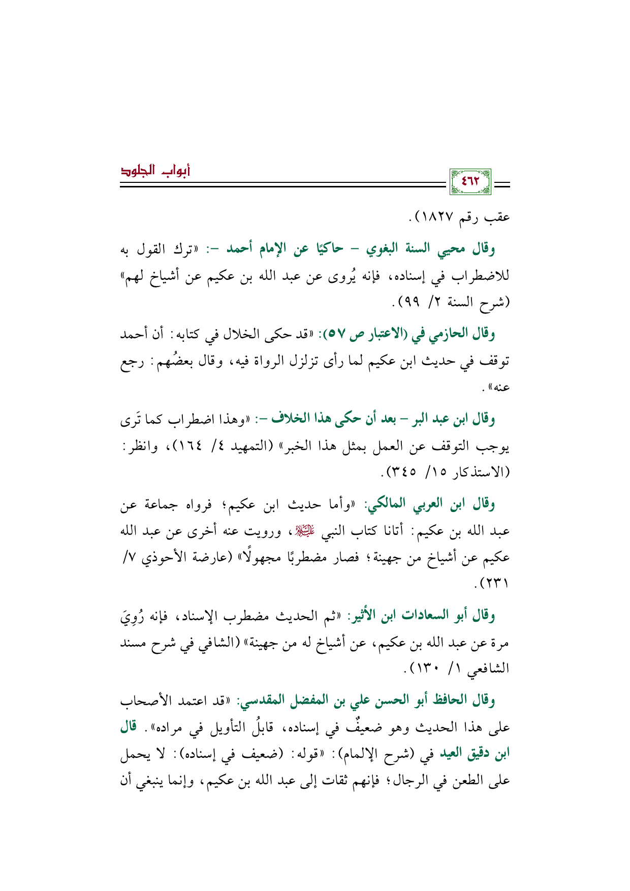 وقال ابن العربي المالكي: ((وأما حديث ابن عكيم؛ فرواه جماعة عن عبد الله بن عكيم: أتانا كتاب النبي عليه السلام، ورويت عنه أخرى عن عبد الله عكيم عن أشياخ من جهينة؛ فصار مضطربًا مجهولًا)) (عارضة الأحوذي ٧/ ٢٣١).