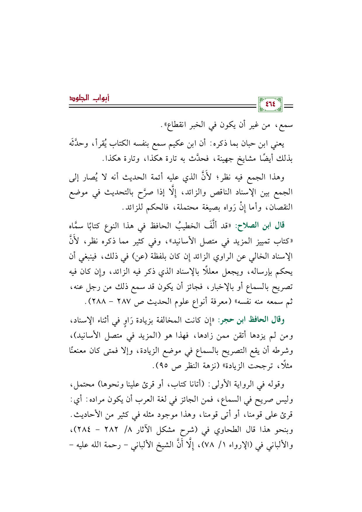 قال ابن الصلاح: ((قد ألَّفَ الخطيبُ الحافظ في هذا النوع كتابًا سمَّاه ((كتاب تمييز المزيد في متصل الأسانيد))، وفي كثير مما ذكره نظر، لأَنَّ الإسناد الخالي عن الراوي الزائد إِن كان بلفظة (عن) في ذلك، فينبغي أن يحكم بإرساله، ويجعل معللًا بالإسناد الذي ذكر فيه الزائد، وإِن كان فيه تصريح بالسماع أو بالإخبار، فجائز أن يكون قد سمع ذلك من رجل عنه، ثم سمعه منه نفسه)) (معرفة أنواع علوم الحديث صـ ٢٨٧ - ٢٨٨).