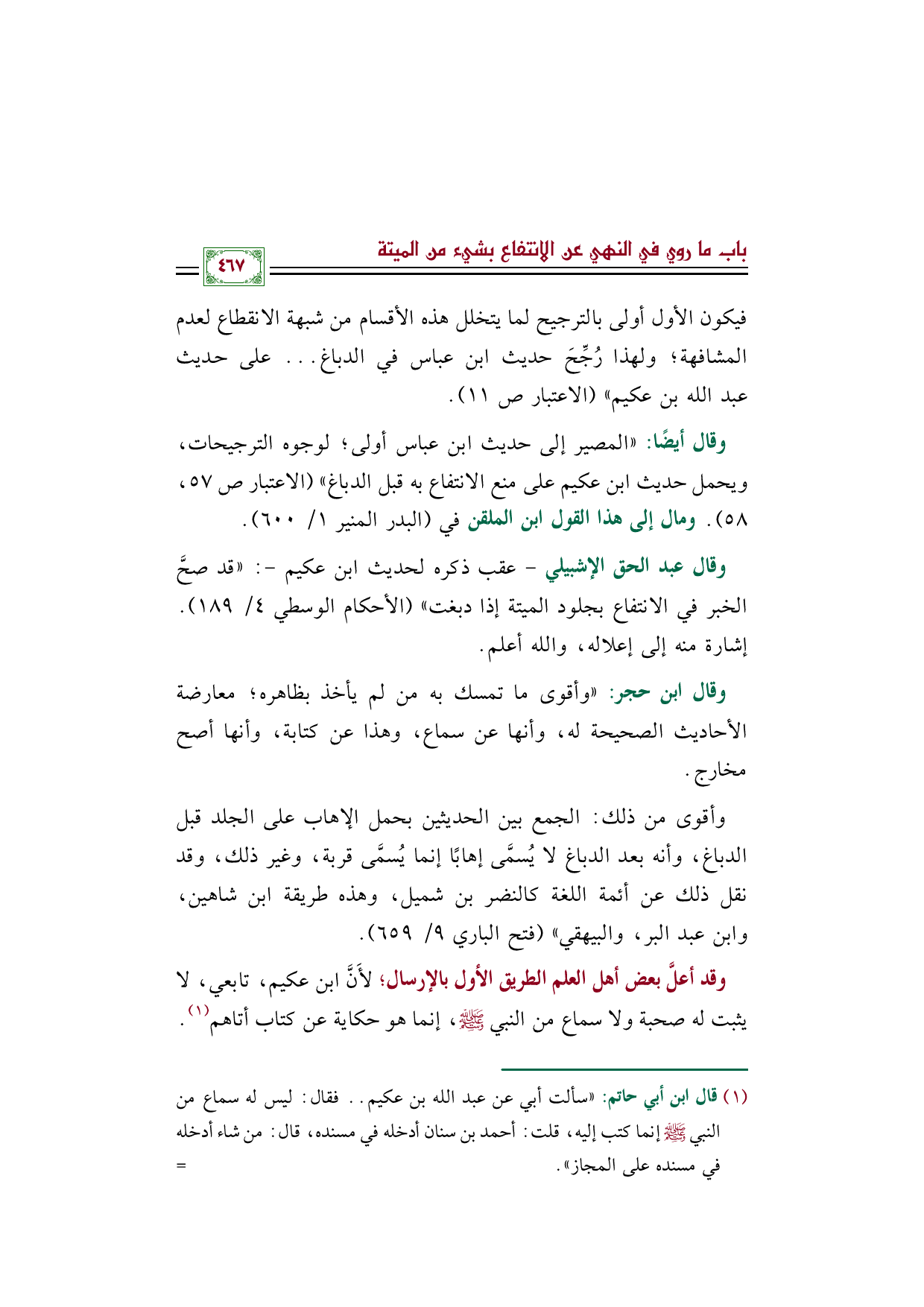 وقال عبد الحق الإشبيلي -عقب ذكره لحديث ابن عكيم-: ((قد صحَّ الخبر في الانتفاع بجلود الميتة إذا دبغت)) (الأحكام الوسطي ٤/ ١٨٩). إشارة منه إلى إعلاله، والله أعلم.