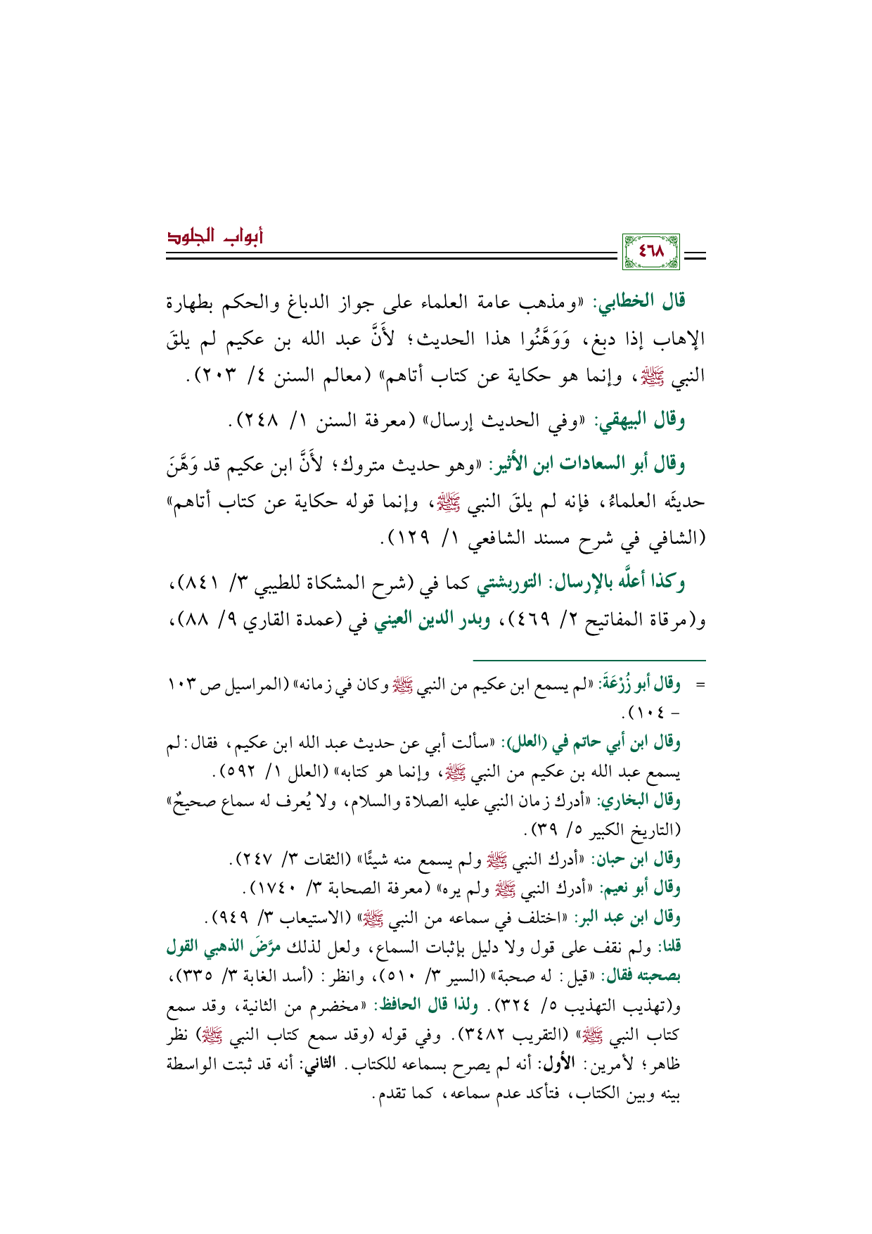 قال الخطابي: ((ومذهب عامة العلماء على جواز الدباغ والحكم بطهارة الإهاب إذا دبغ، وَوَهَّنُوا هذا الحديث؛ لأَنَّ عبد الله بن عكيم لم يلقَ النبي صلى الله عليه وسلم، وإنما هو حكاية عن كتاب أتاهم)) (معالم السنن ٤/ ٢٠٣).