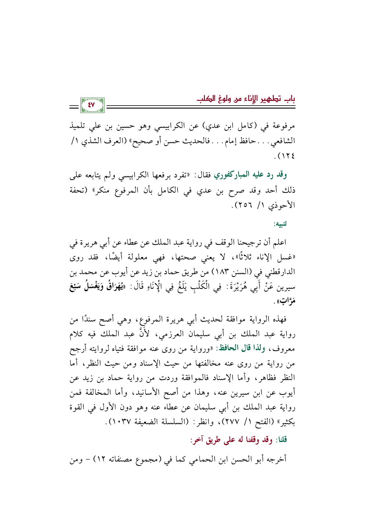 اعلم أن ترجيحنا الوقف في رواية عبد الملك عن عطاء عن أبي هريرة في ((غسل الإناء ثلاثًا))، لا يعني صحتها، فهي معلولة أيضًا، فقد روى الدارقطني في (السنن ١٨٣) من طريق حماد بن زيد عن أيوب عن محمد بن سيرين عَنْ أَبِي هُرَيْرَةَ: فِي الْكَلْبِ يَلَغُ فِي الْإِنَاءِ قَالَ: ((يُهَرَاقُ وَيَغْسَلُ سَبْعَ مَرَّاتٍ)).
