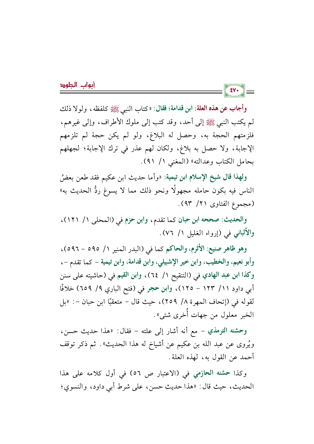ولهذا قال شيخ الإسلام ابن تيمية: ((وأما حديث ابن عكيم فقد طعن بعضُ الناس فيه بكون حامله مجهولًا ونحو ذلك مما لا يسوغ ردُّ الحديث به)) (مجموع الفتاوى ٢١/ ٩٣).