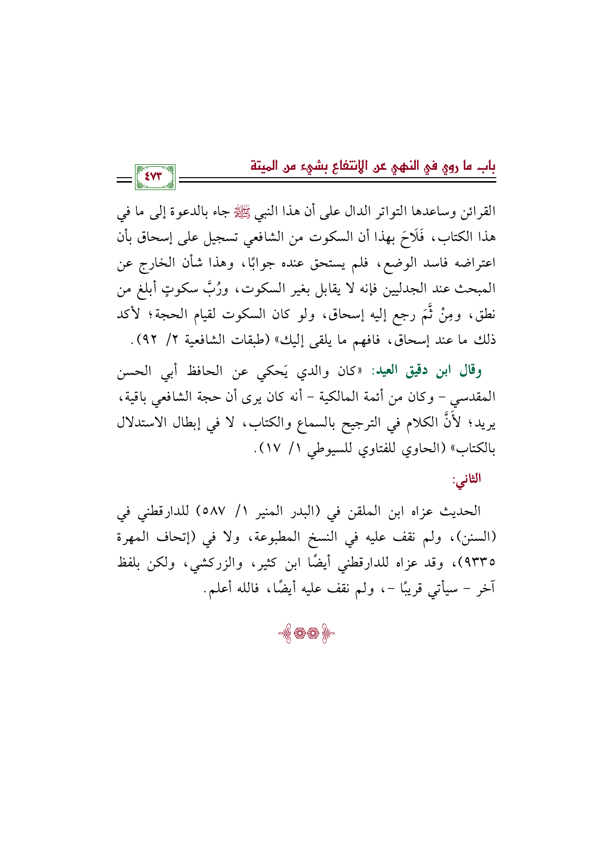 وقال ابن دقيق العيد: ((كان والدي يَحكي عن الحافظ أبي الحسن المقدسي -وكان من أئمة المالكية - أنه كان يرى أن حجة الشافعي باقية، يريد؛ لأَنَّ الكلام في الترجيح بالسماع والكتاب، لا في إبطال الاستدلال بالكتاب)) (الحاوي للفتاوي للسيوطي ١/ ١٧).