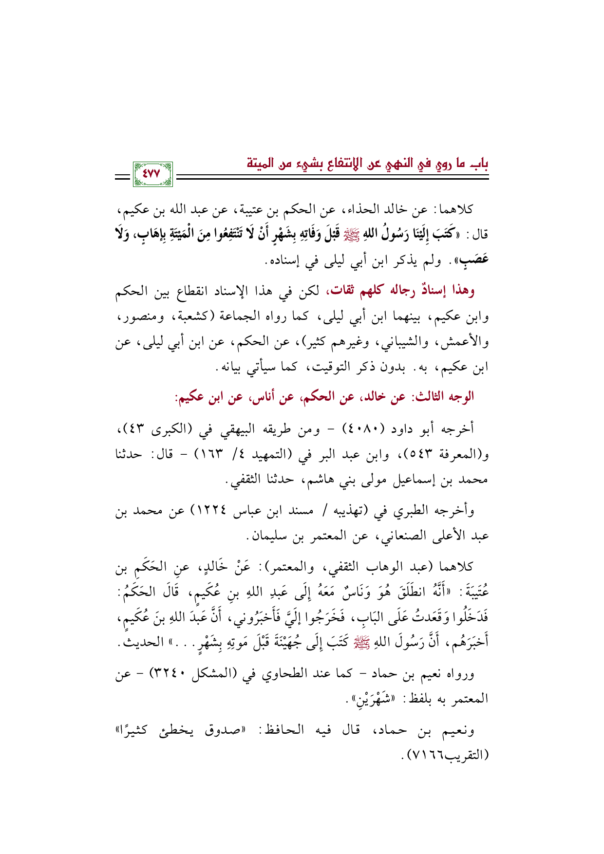 كلاهما: عن خالد الحذاء، عن الحكم بن عتيبة، عن عبد الله بن عكيم، قال: ((كَتَبَ إِلَيْنَا رَسُولُ اللهِ صلى الله عليه وسلم قَبْلَ وَفَاتِهِ بِشَهْرٍ أَنْ لَا تَنْتَفِعُوا مِنَ الْمَيْتَةِ بِإهَابٍ، وَلَا عَصَبٍ)). ولم يذكر ابن أبي ليلى في إسناده.