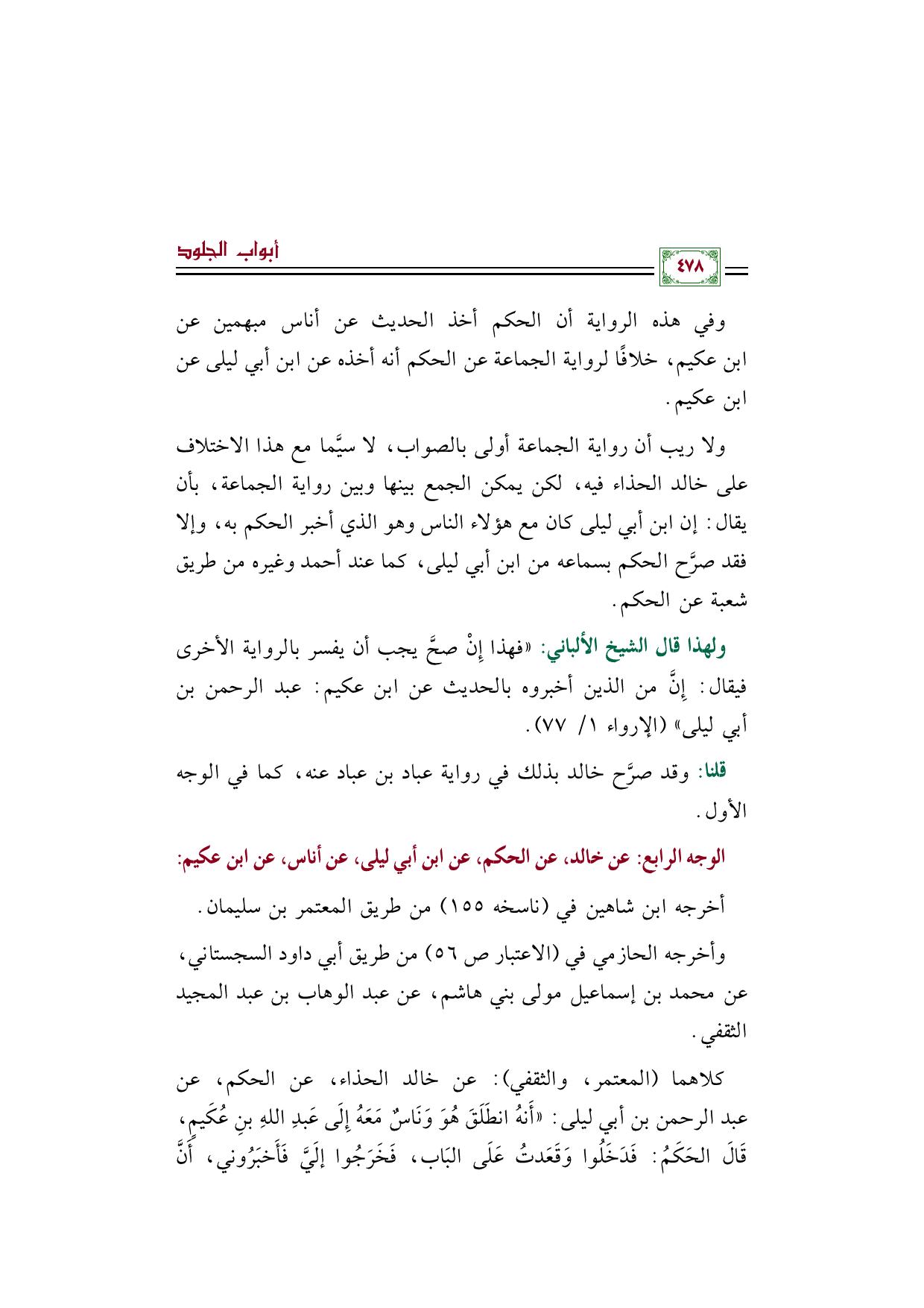 ولا ريب أن رواية الجماعة أولى بالصواب، لا سيَّما مع هذا الاختلاف على خالد الحذاء فيه، لكن يمكن الجمع بينها وبين رواية الجماعة، بأن يقال: إن ابن أبي ليلى كان مع هؤلاء الناس وهو الذي أخبر الحكم به، وإلا فقد صرَّح الحكم بسماعه من ابن أبي ليلى، كما عند أحمد وغيره من طريق شعبة عن الحكم.