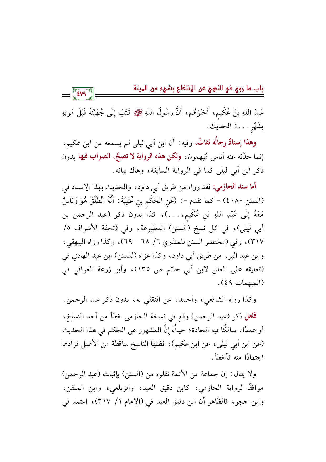 أما سند الحازمي: فقد رواه من طريق أبي داود، والحديث بهذا الإسناد في (السنن ٤٠٨٠) -كما تقدم-: (عَنِ الحَكَمِ بنِ عُتَيبَةَ: أَنَّهُ انْطَلَقَ هُوَ وَنَاسٌ مَعَهُ إِلَى عَبْدِ اللهِ بْنِ عُكَيمٍ، ... )، كذا بدون ذكر (عبد الرحمن بن أبي ليلى)، في كل نسخ (السنن) المطبوعة، وفي (تحفة الأشراف ٥/ ٣١٧)، وفي (مختصر السنن للمنذري ٦/ ٦٨ - ٦٩)، وكذا رواه البيهقي، وابن عبد البر، من طريق أبي داود، وكذا عزاه (للسنن) ابن عبد الهادي في (تعليقه على العلل لابن أبي حاتم صـ ١٣٥)، وأبو زرعة العراقي في (المبهمات ٤٩).