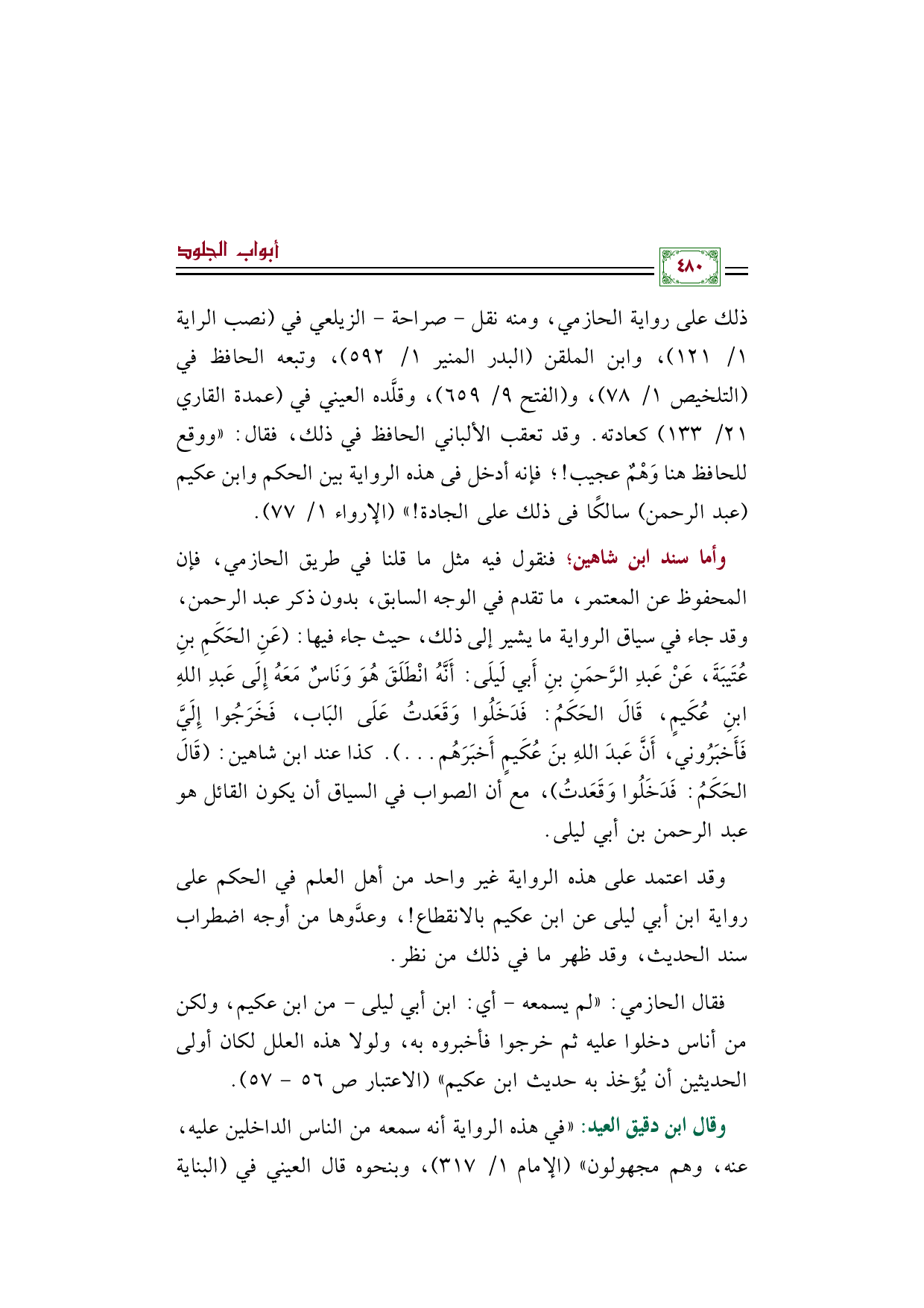 ذلك على رواية الحازمي، ومنه نقل -صراحة- الزيلعي في (نصب الراية ١/ ١٢١)، وابن الملقن (البدر المنير ١/ ٥٩٢)، وتبعه الحافظ في (التلخيص ١/ ٧٨)، و (الفتح ٩/ ٦٥٩)، وقلَّده العيني في (عمدة القاري ٢١/ ١٣٣) كعادته. وقد تعقب الألباني الحافظ في ذلك، فقال: ((ووقع للحافظ هنا وَهْمٌ عجيب! ؛ فإنه أدخل فى هذه الرواية بين الحكم وابن عكيم (عبد الرحمن) سالكًا فى ذلك على الجادة! )) (الإرواء ١/ ٧٧).