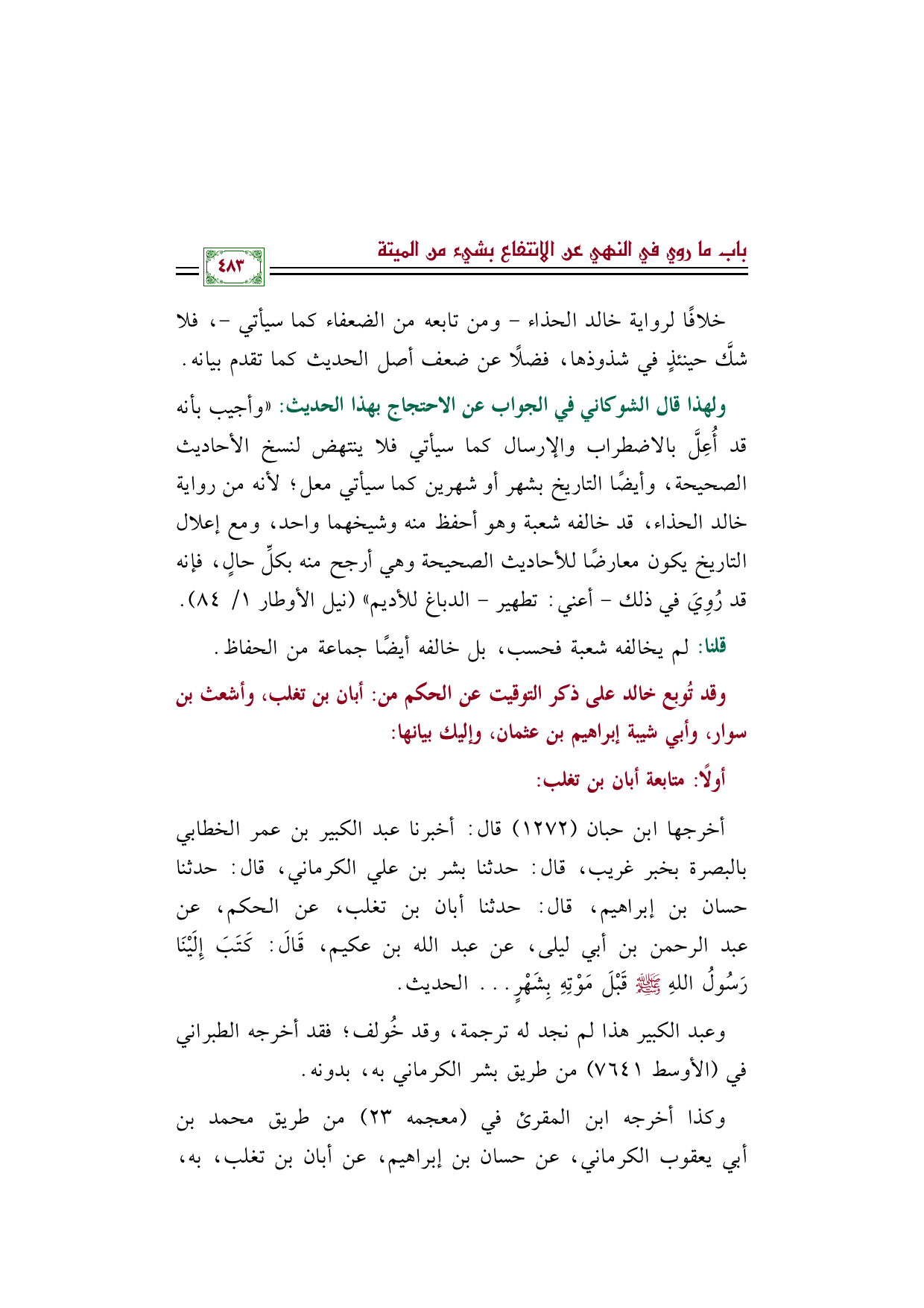ولهذا قال الشوكاني في الجواب عن الاحتجاج بهذا الحديث: ((وأجيب بأنه قد أُعِلَّ بالاضطراب والإرسال كما سيأتي فلا ينتهض لنسخ الأحاديث الصحيحة، وأيضًا التاريخ بشهر أو شهرين كما سيأتي معل؛ لأنه من رواية خالد الحذاء، قد خالفه شعبة وهو أحفظ منه وشيخهما واحد، ومع إعلال التاريخ يكون معارضًا للأحاديث الصحيحة وهي أرجح منه بكلِّ حالٍ، فإنه قد رُوِيَ في ذلك -أعني: تطهير- الدباغ للأديم)) (نيل الأوطار ١/ ٨٤).