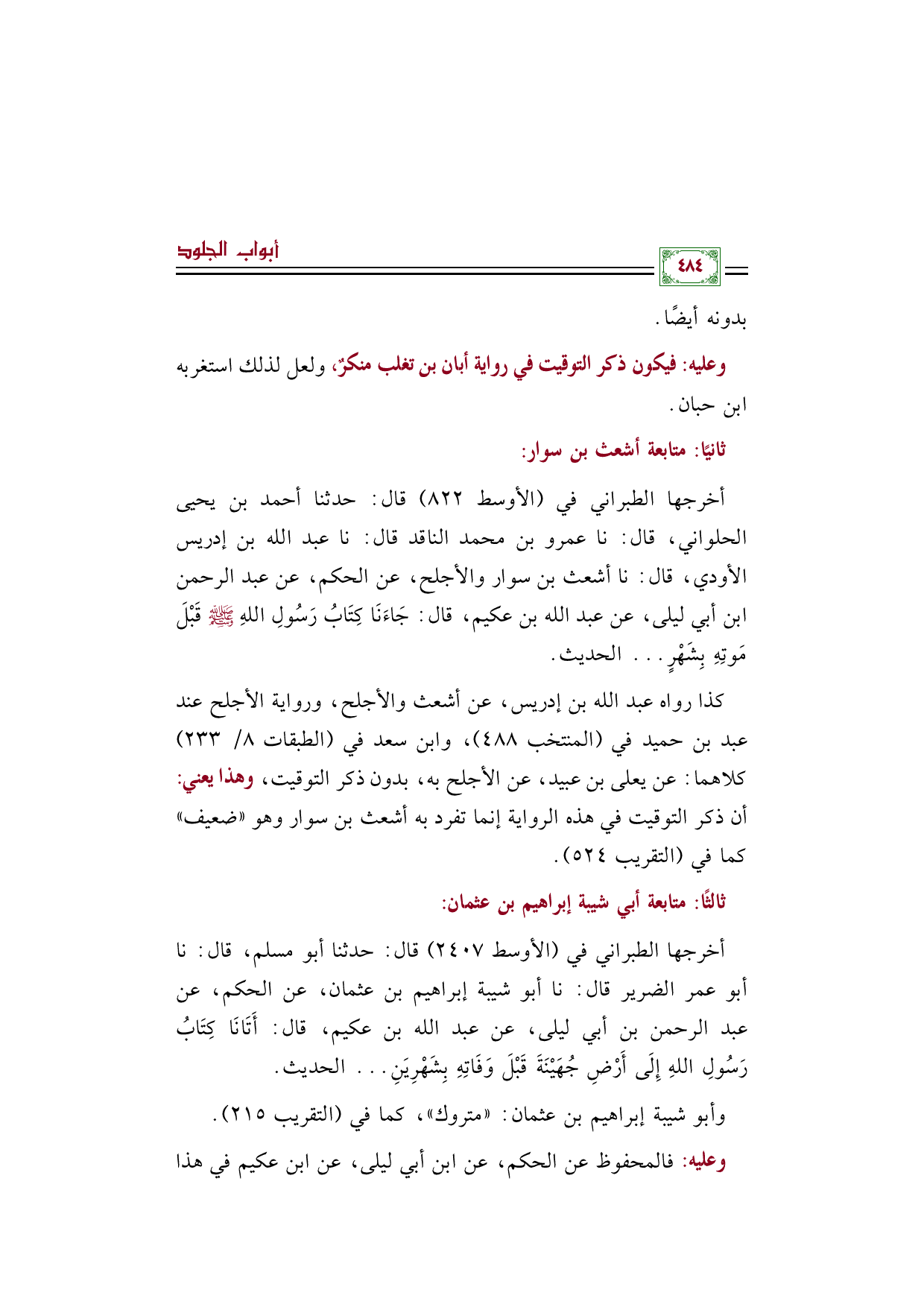 وعليه: فيكون ذكر التوقيت في رواية أبان بن تغلب منكرٌ، ولعل لذلك استغربه ابن حبان.