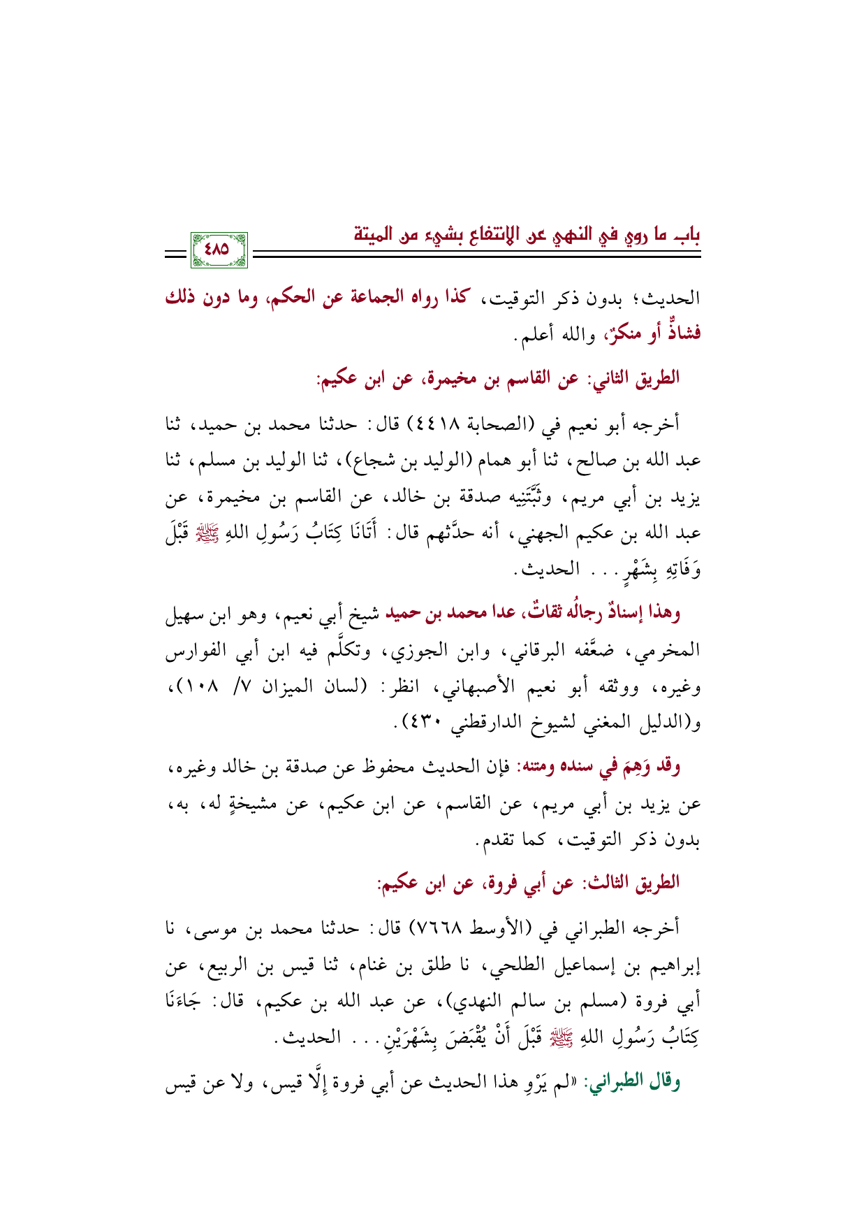 أخرجه أبو نعيم في (الصحابة ٤٤١٨) قال: حدثنا محمد بن حميد، ثنا عبد الله بن صالح، ثنا أبو همام (الوليد بن شجاع)، ثنا الوليد بن مسلم، ثنا يزيد بن أبي مريم، وثَبَّتَنِيه صدقة بن خالد، عن القاسم بن مخيمرة، عن عبد الله بن عكيم الجهني، أنه حدَّثهم قال: أَتَانَا كِتَابُ رَسُولِ اللهِ صلى الله عليه وسلم قَبْلَ وَفَاتِهِ بِشَهْرٍ ... الحديث.