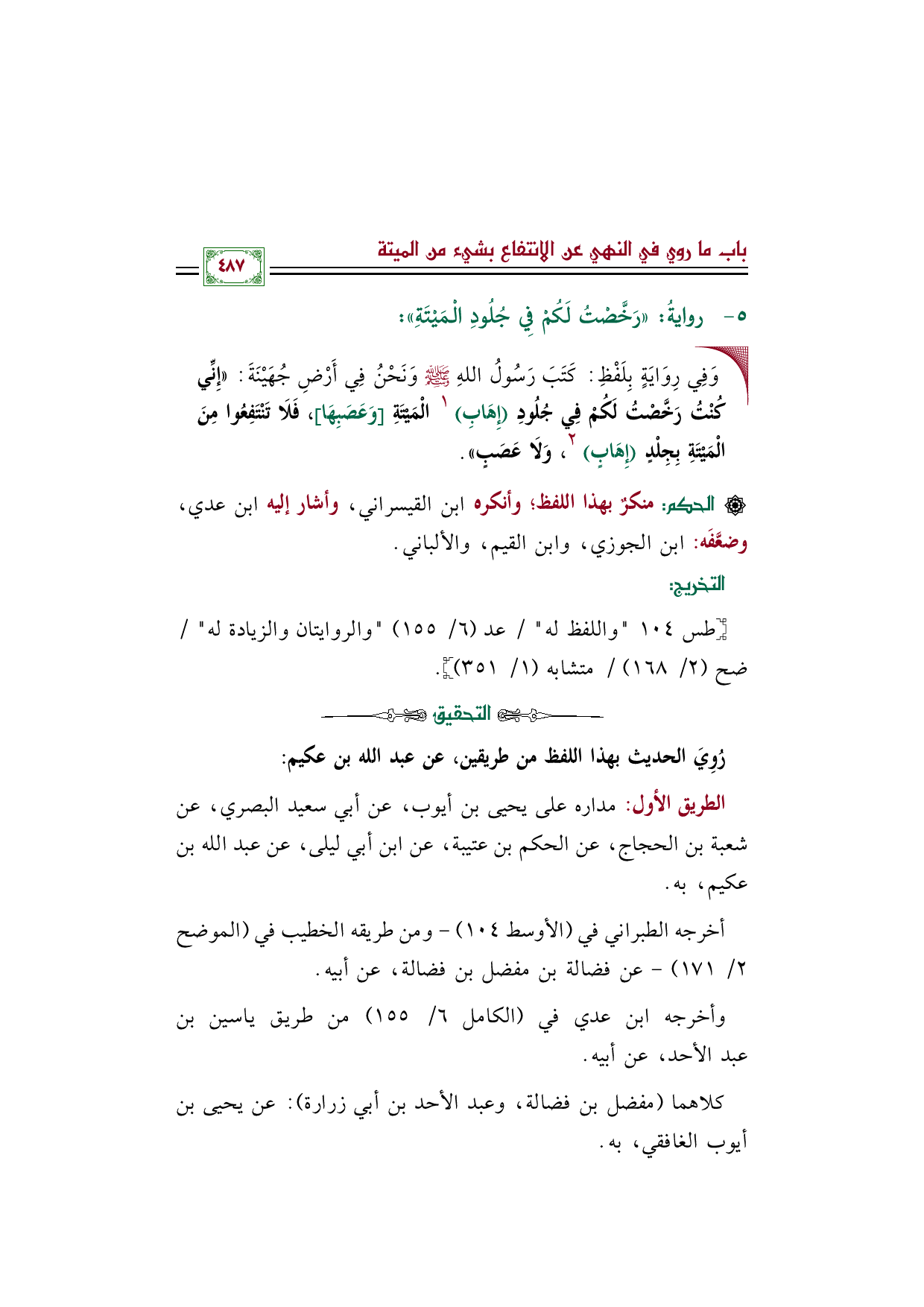 رُوِيَ الحديث بهذا اللفظ من طريقين، عن عبد الله بن عكيم: