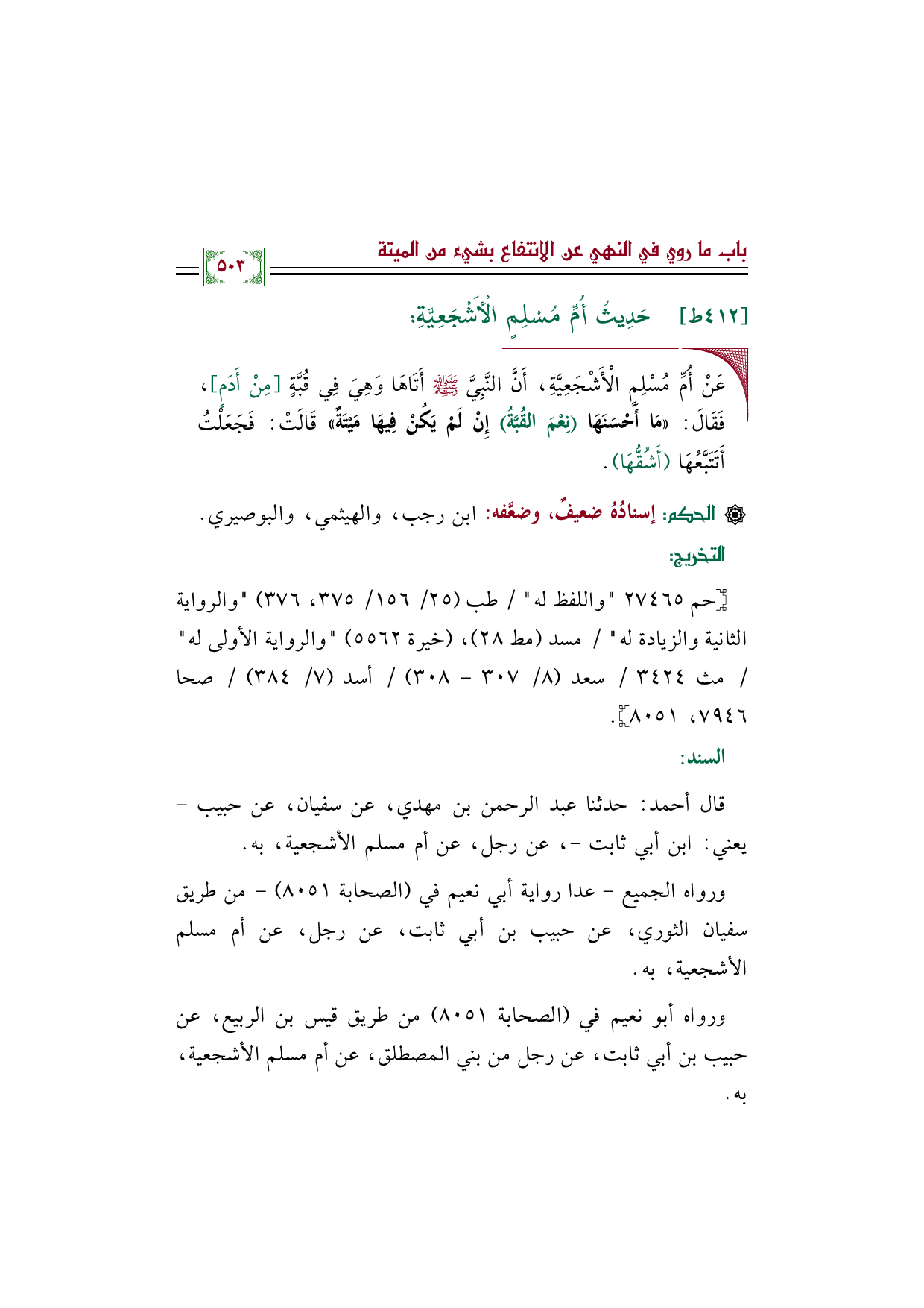 قال أحمد: حدثنا عبد الرحمن بن مهدي، عن سفيان، عن حبيب -يعني: ابن أبي ثابت-، عن رجل، عن أم مسلم الأشجعية، به.
