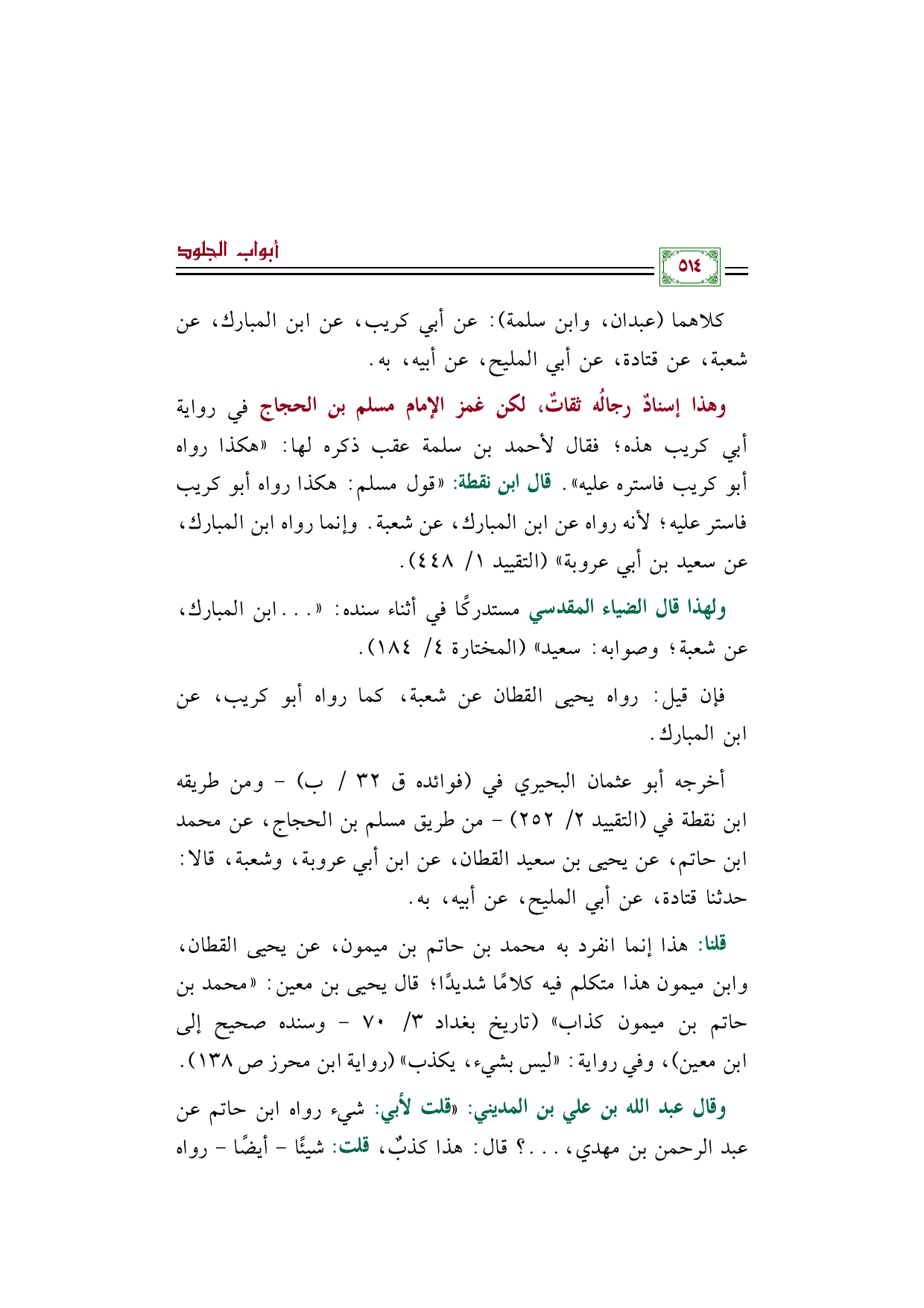 وهذا إسنادٌ رجالُه ثقاتٌ، لكن غمز الإمام مسلم بن الحجاج في رواية أبي كريب هذه؛ فقال لأحمد بن سلمة عقب ذكره لها: ((هكذا رواه أبو كريب فاستره عليه)). قال ابن نقطة: ((قول مسلم: هكذا رواه أبو كريب فاستر عليه؛ لأنه رواه عن ابن المبارك، عن شعبة. وإنما رواه ابن المبارك، عن سعيد بن أبي عروبة)) (التقييد ١/ ٤٤٨).