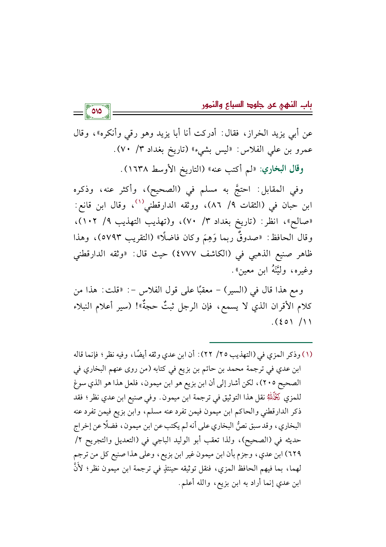 (¬١) وذكر المزي في (التهذيب ٢٥/ ٢٢): أن ابن عدي وثقه أيضًا، وفيه نظر؛ فإنما قاله ابن عدي في ترجمة محمد بن حاتم بن بزيع في كتابه (من روى عنهم البخاري في الصحيح ٢٠٥)، لكن أشار إلى أن ابن بزيع هو ابن ميمون، فلعل هذا هو الذي سوغ للمزي رحمه الله نقل هذا التوثيق في ترجمة ابن ميمون. وفي صنيع ابن عدي نظر؛ فقد ذكر الدارقطني والحاكم ابن ميمون فيمن تفرد عنه مسلم، وابن بزيع فيمن تفرد عنه البخاري، وقد سبق نصُّ البخاري على أنه لم يكتب عن ابن ميمون، فضلًا عن إخراج حديثه في (الصحيح)، ولذا تعقب أبو الوليد الباجي في (التعديل والتجريح ٢/ ٦٢٩) ابن عدي، وجزم بأن ابن ميمون غير ابن بزيع، وعلى هذا صنيع كل من ترجم لهما، بما فيهم الحافظ المزي، فنقل توثيقه حينئذٍ في ترجمة ابن ميمون نظر؛ لأَنَّ ابن عدي إنما أراد به ابن بزيع، والله أعلم.