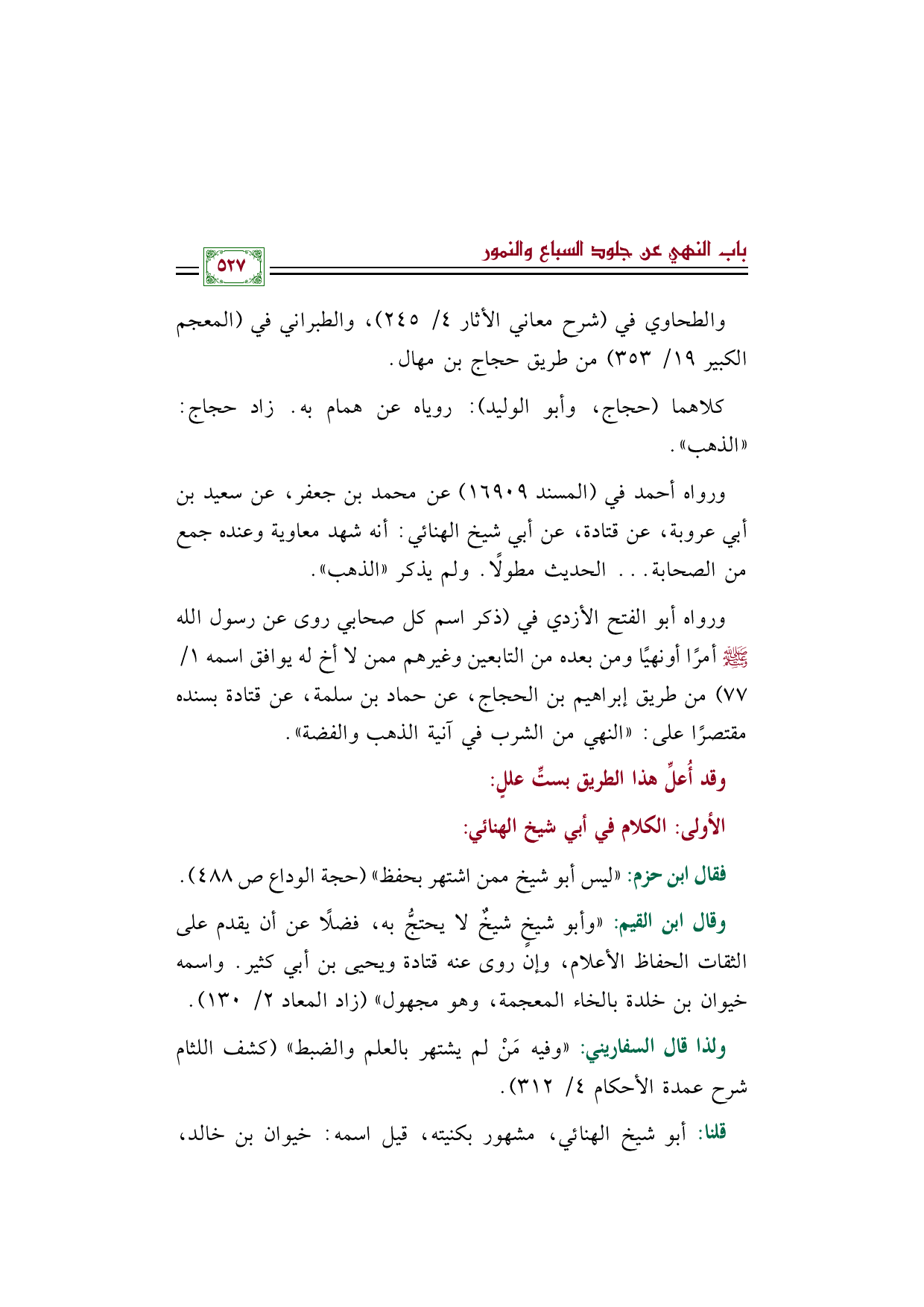 ورواه أحمد في (المسند ١٦٩٠٩) عن محمد بن جعفر، عن سعيد بن أبي عروبة، عن قتادة، عن أبي شيخ الهنائي: أنه شهد معاوية وعنده جمع من الصحابة ... الحديث مطولًا. ولم يذكر ((الذهب)).
