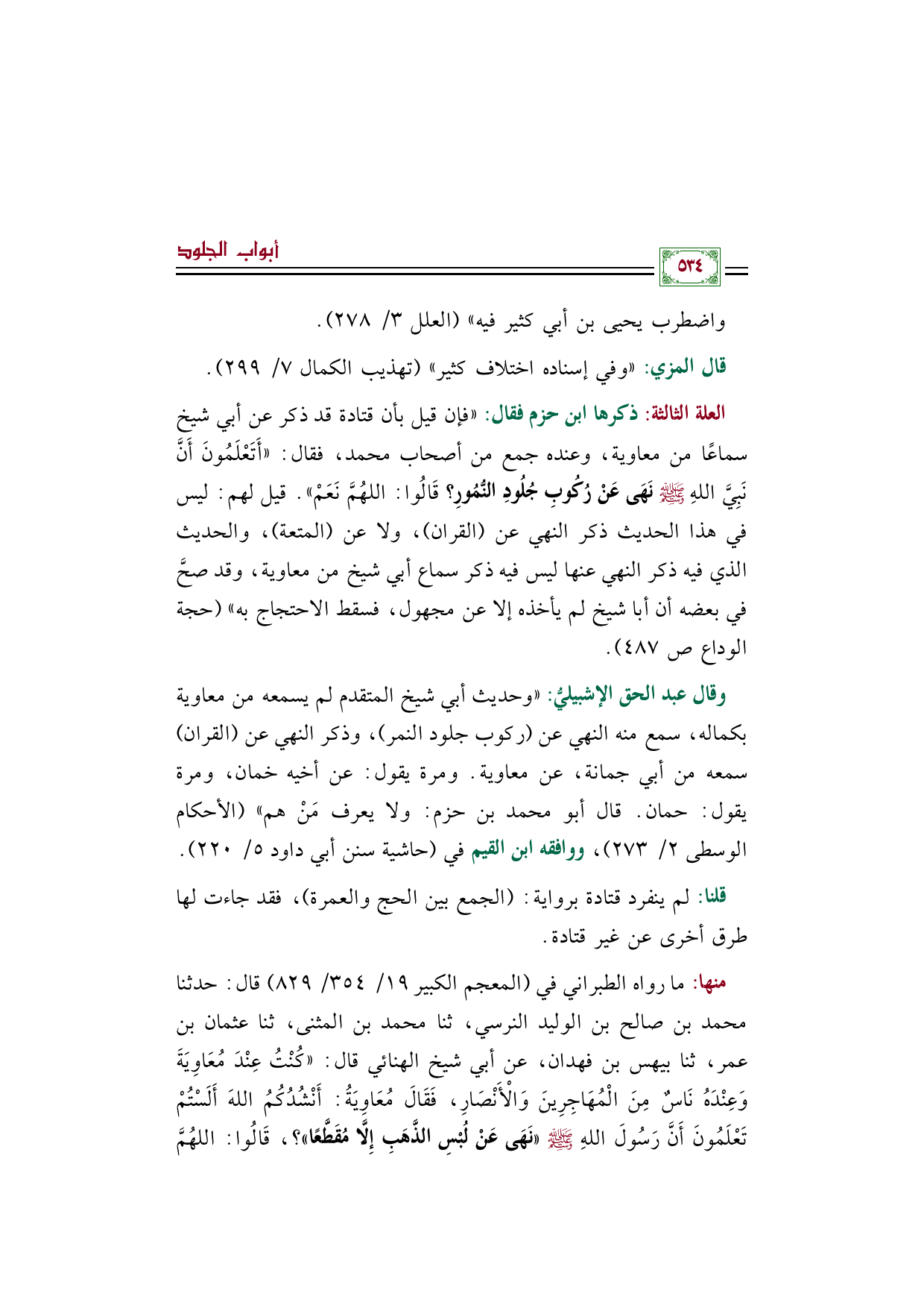 العلة الثالثة: ذكرها ابن حزم فقال: ((فإن قيل بأن قتادة قد ذكر عن أبي شيخ سماعًا من معاوية، وعنده جمع من أصحاب محمد، فقال: ((أَتَعْلَمُونَ أَنَّ نَبِيَّ اللهِ صلى الله عليه وسلم نَهَى عَنْ رُكُوبِ جُلُودِ النُّمُورِ؟ قَالُوا: اللهُمَّ نَعَمْ)). قيل لهم: ليس في هذا الحديث ذكر النهي عن (القران)، ولا عن (المتعة)، والحديث الذي فيه ذكر النهي عنها ليس فيه ذكر سماع أبي شيخ من معاوية، وقد صحَّ في بعضه أن أبا شيخ لم يأخذه إلا عن مجهول، فسقط الاحتجاج به)) (حجة الوداع صـ ٤٨٧).
