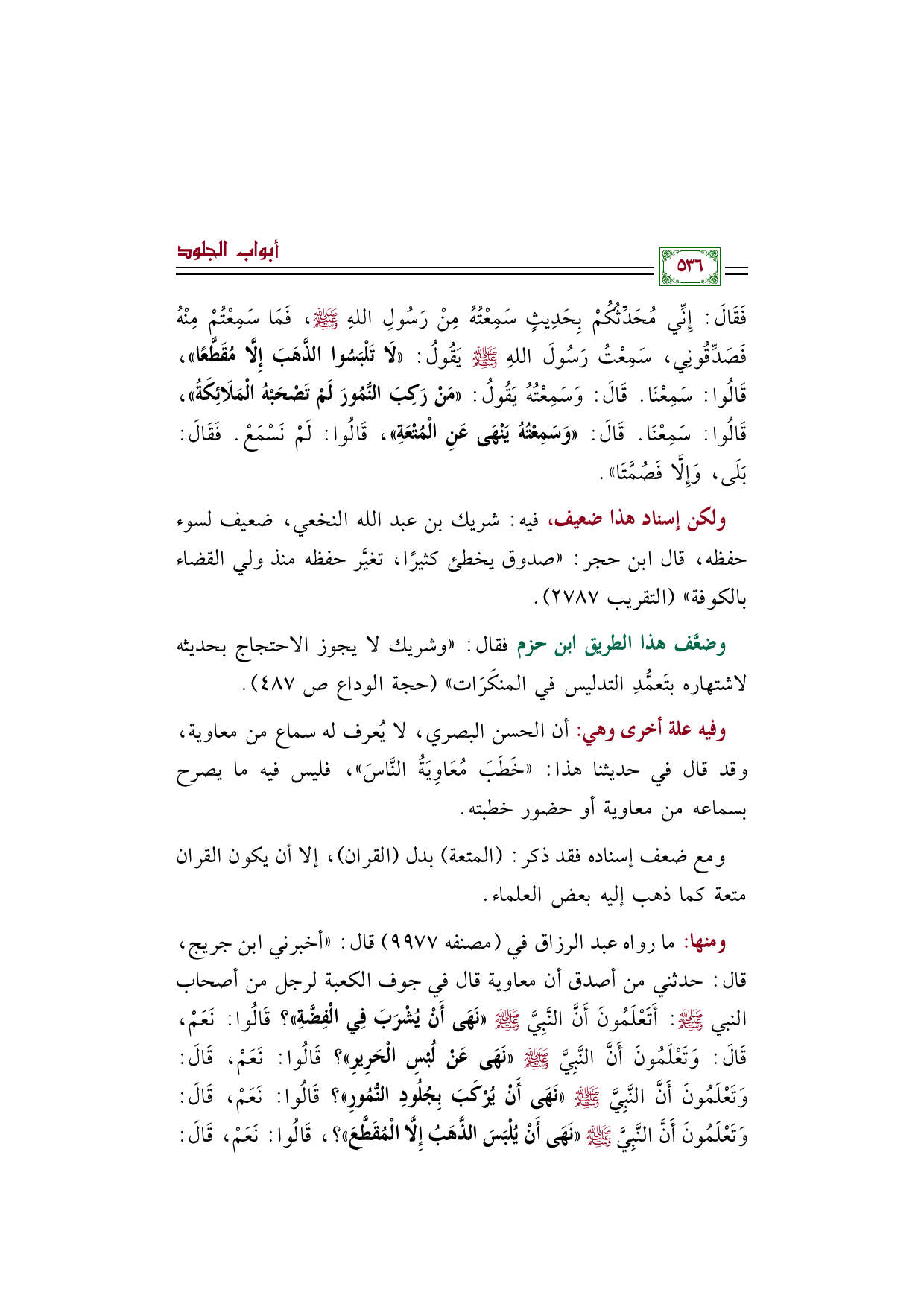 وضعَّف هذا الطريق ابن حزم فقال: ((وشريك لا يجوز الاحتجاج بحديثه لاشتهاره بتَعمُّدِ التدليس في المنكَرَات)) (حجة الوداع صـ ٤٨٧).