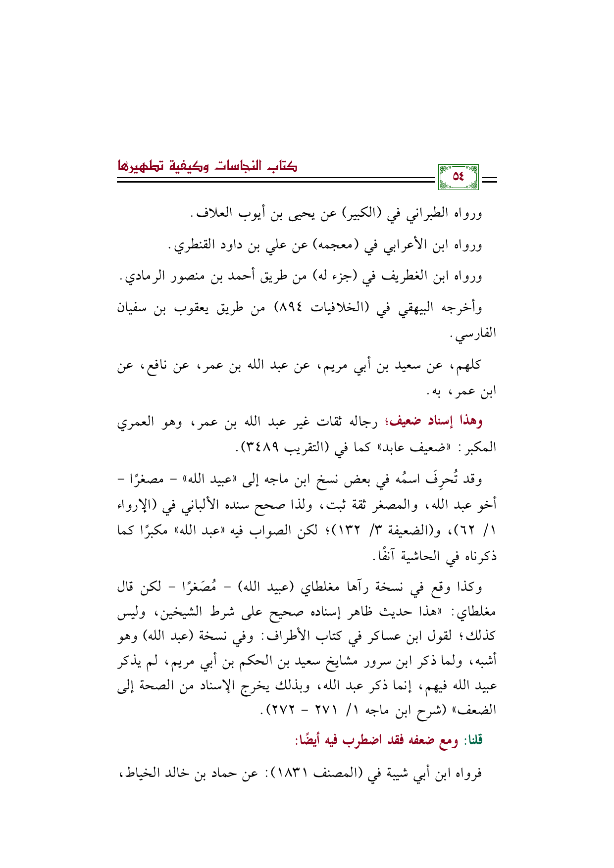 وقد تُحرِفَ اسمُه في بعض نسخ ابن ماجه إلى ((عبيد الله)) - مصغرًا - أخو عبد الله، والمصغر ثقة ثبت، ولذا صحح سنده الألباني في (الإرواء ١/ ٦٢)، و (الضعيفة ٣/ ١٣٢)؛ لكن الصواب فيه ((عبد الله)) مكبرًا كما ذكرناه في الحاشية آنفًا.