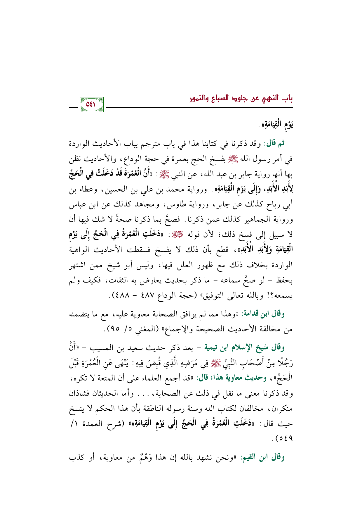 وقال شيخ الإسلام ابن تيمية -بعد ذكر حديث سعيد بن المسيب- ((أَنَّ رَجُلًا مِنْ أَصْحَابِ النَّبِيِّ صلى الله عليه وسلم فِي مَرَضِهِ الَّذِي قُبِضَ فِيهِ: يَنْهَى عَنِ الْعُمْرَةِ قَبْلَ الْحَجِّ))، وحديث معاوية هذا؛ قال: ((قد أجمع العلماء على أن المتعة لا تكره، وقد ذكرنا معنى ما نقل في ذلك عن الصحابة، ... وأما الحديثان فشاذان منكران، مخالفان لكتاب الله وسنة رسوله الناطقة بأن هذا الحكم لا ينسخ حيث قال: ((دَخَلَتِ الْعُمْرَةُ فِي الْحَجِّ إِلَى يَوْمِ الْقِيَامَةِ)))) (شرح العمدة ١/ ٥٤٩).
