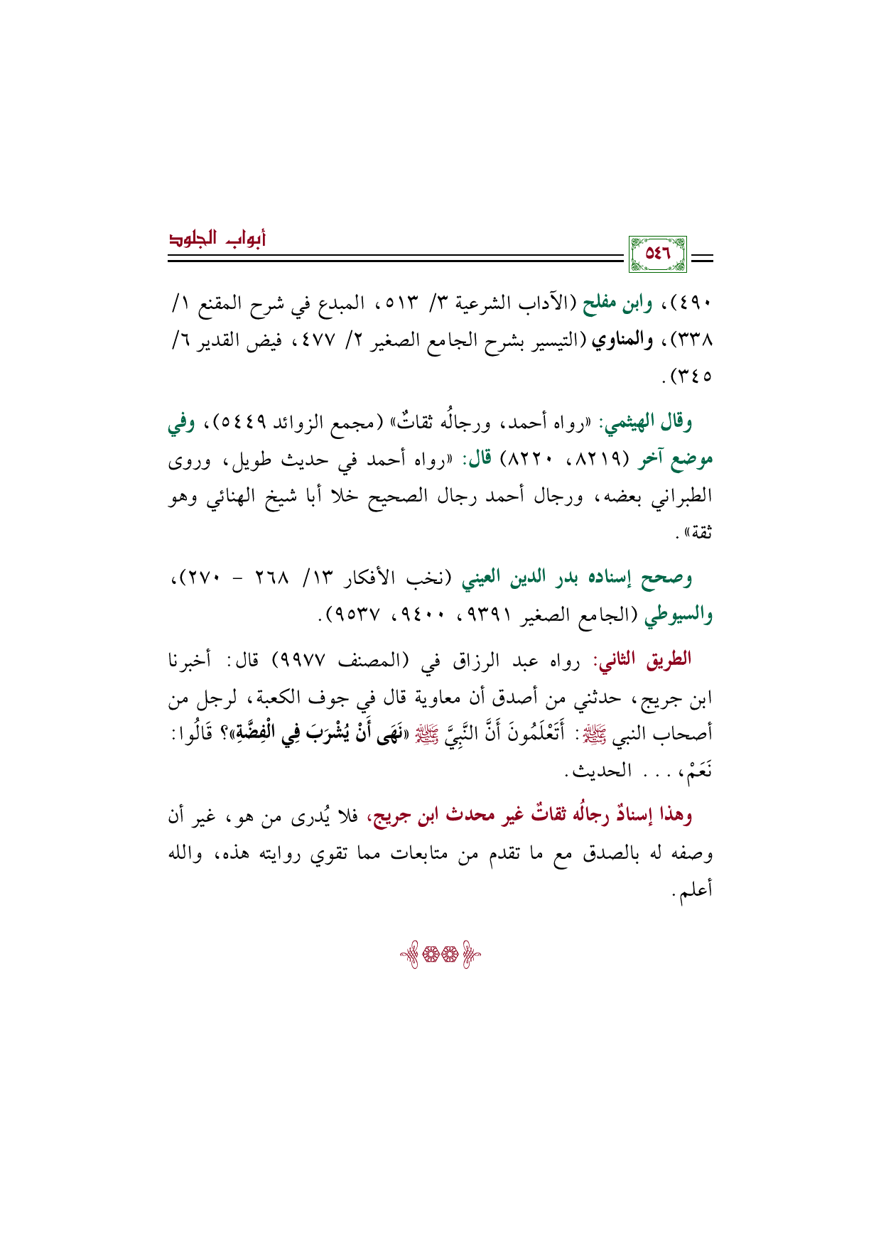 ٤٩٠)، وابن مفلح (الآداب الشرعية ٣/ ٥١٣، المبدع في شرح المقنع ١/ ٣٣٨)، والمناوي (التيسير بشرح الجامع الصغير ٢/ ٤٧٧، فيض القدير ٦/ ٣٤٥).