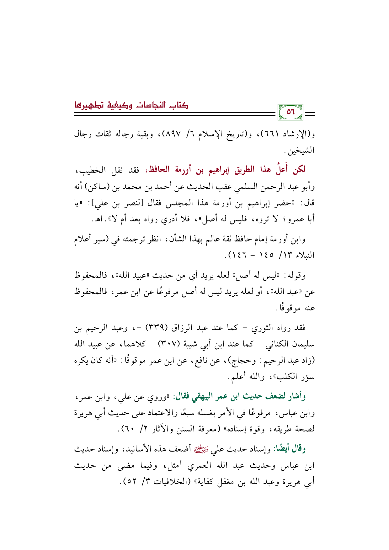 وأشار لضعف حديث ابن عمر البيهقي فقال: ((وروي عن علي، وابن عمر، وابن عباس، مرفوعًا في الأمر بغسله سبعًا والاعتماد على حديث أبي هريرة لصحة طريقه، وقوة إسناده)) (معرفة السنن والآثار ٢/ ٦٠).