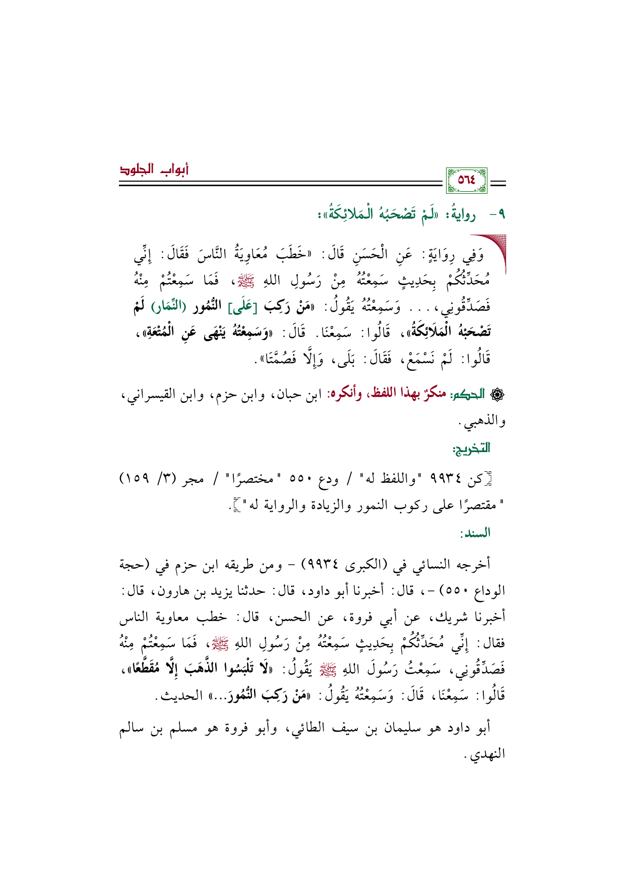 أخرجه النسائي في (الكبرى ٩٩٣٤) -ومن طريقه ابن حزم في (حجة الوداع ٥٥٠) -، قال: أخبرنا أبو داود، قال: حدثنا يزيد بن هارون، قال: أخبرنا شريك، عن أبي فروة، عن الحسن، قال: خطب معاوية الناس فقال: إِنِّي مُحَدِّثُكُمْ بِحَدِيثٍ سَمِعْتُهُ مِنْ رَسُولِ اللهِ صلى الله عليه وسلم، فَمَا سَمِعْتُمْ مِنْهُ فَصَدِّقُونِي، سَمِعْتُ رَسُولَ اللهِ صلى الله عليه وسلم يَقُولُ: ((لَا تَلْبَسُوا الذَّهَبَ إِلَّا مُقَطَّعًا))، قَالُوا: سَمِعْنَا، قَالَ: وَسَمِعْتُهُ يَقُولُ: ((مَنْ رَكِبَ النُّمُورَ ... )) الحديث.