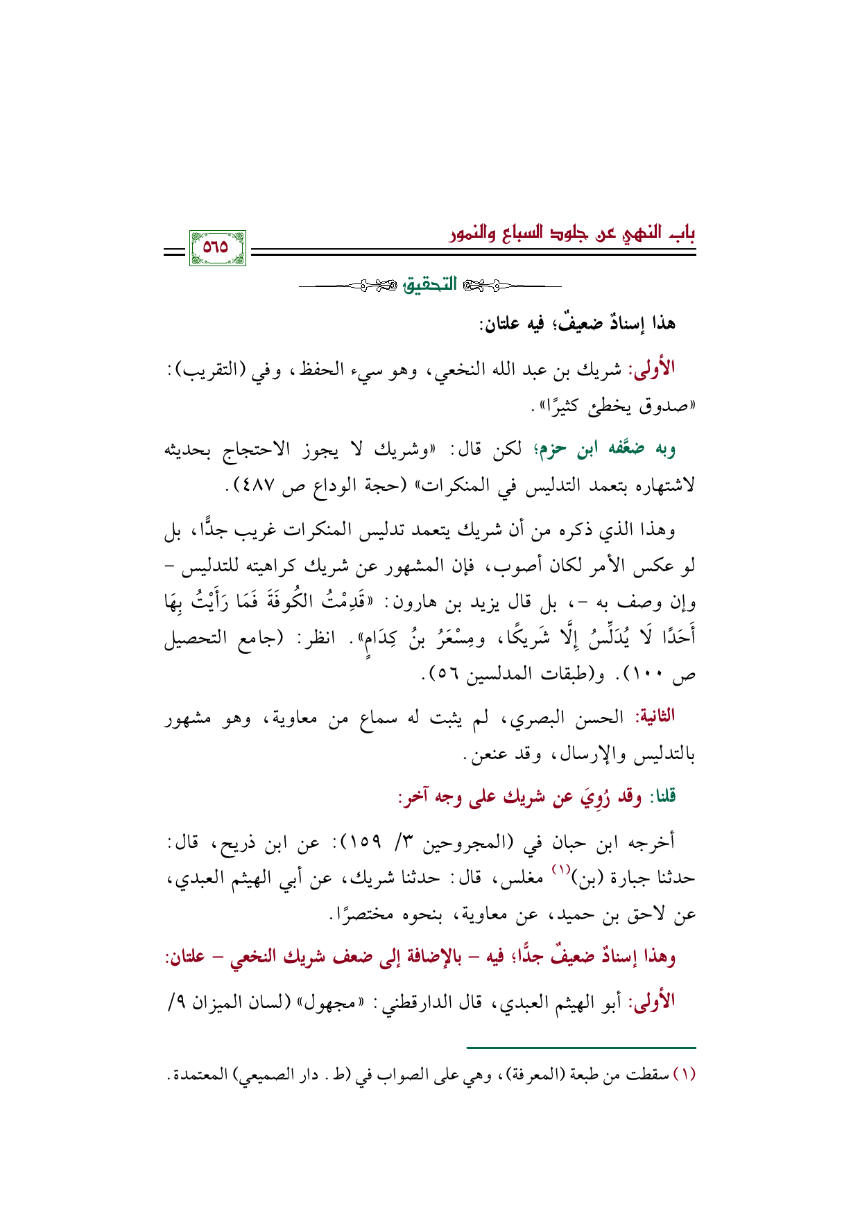 وبه ضعَّفه ابن حزم؛ لكن قال: ((وشريك لا يجوز الاحتجاج بحديثه لاشتهاره بتعمد التدليس في المنكرات)) (حجة الوداع صـ ٤٨٧).